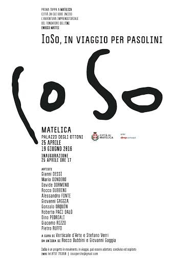 Il prossimo 25 aprile, a Palazzo degli Ottoni di Matelica (MC), aprirà i battenti la prima tappa espositiva del progetto. Partendo da quel IoSo, Gianni Dessì, Davide Dormino, Rocco Dubbini, Alessandro Fonte, Giovanni Gaggia, Gonzalo Orquìn, Roberto Paci Dalò, Giacomo Rizzo, Mario Dondero, Pietro Ruffo negli anni hanno riflettuto sulla profondità del pensiero di Pasolini con opere che testimoniano l'assoluta attualità delle sue idee. Un percorso in bianco e nero, una scelta consapevole che si rivolge alla memoria intesa non come crogiuolo del ricordo, ma come mezzo propulsore di una società più giusta.