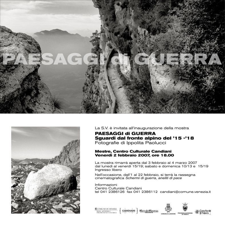 Accanto alle fotografie, altrettanti testi tratti da epistolari di soldati che hanno combattuto sul fronte alpino - sia italiano che austriaco - della Grande Guerra, parole spezzate, talvolta stentate, scritte nelle lettere a casa dalle quali emergono gli sguardi e le emozioni, le paure e le attese degli uomini che passarono, come in un sogno o in un incubo, attraverso quei tre anni e mezzo di guerra, in una serie di “sguardi sul paesaggio”, in immagini e in parole, che rimandano le une alle altre come in uno specchio capace di spezzare i vincoli del tempo. “Ho fatto la scelta” -afferma Ippolita Paolucci- “di servirmi quasi esclusivamente di testimonianze epistolari che danno spesso una descrizione istantanea del paesaggio, un'impressione più vivida del momento vissuto, che meglio "dialogano" con le immagini attuali e che, data la drammaticità della situazione, assumono un carattere di universalità rispetto al tema della guerra e della pace.” Una scelta che ha dato vita ad una serie di immagini incredibilmente emozionanti, pregne dello stupore e dello sgomento di chi ha di fronte cose troppo grandi per non apparire misteriose, purtroppo ancora oggi tristemente attuali.