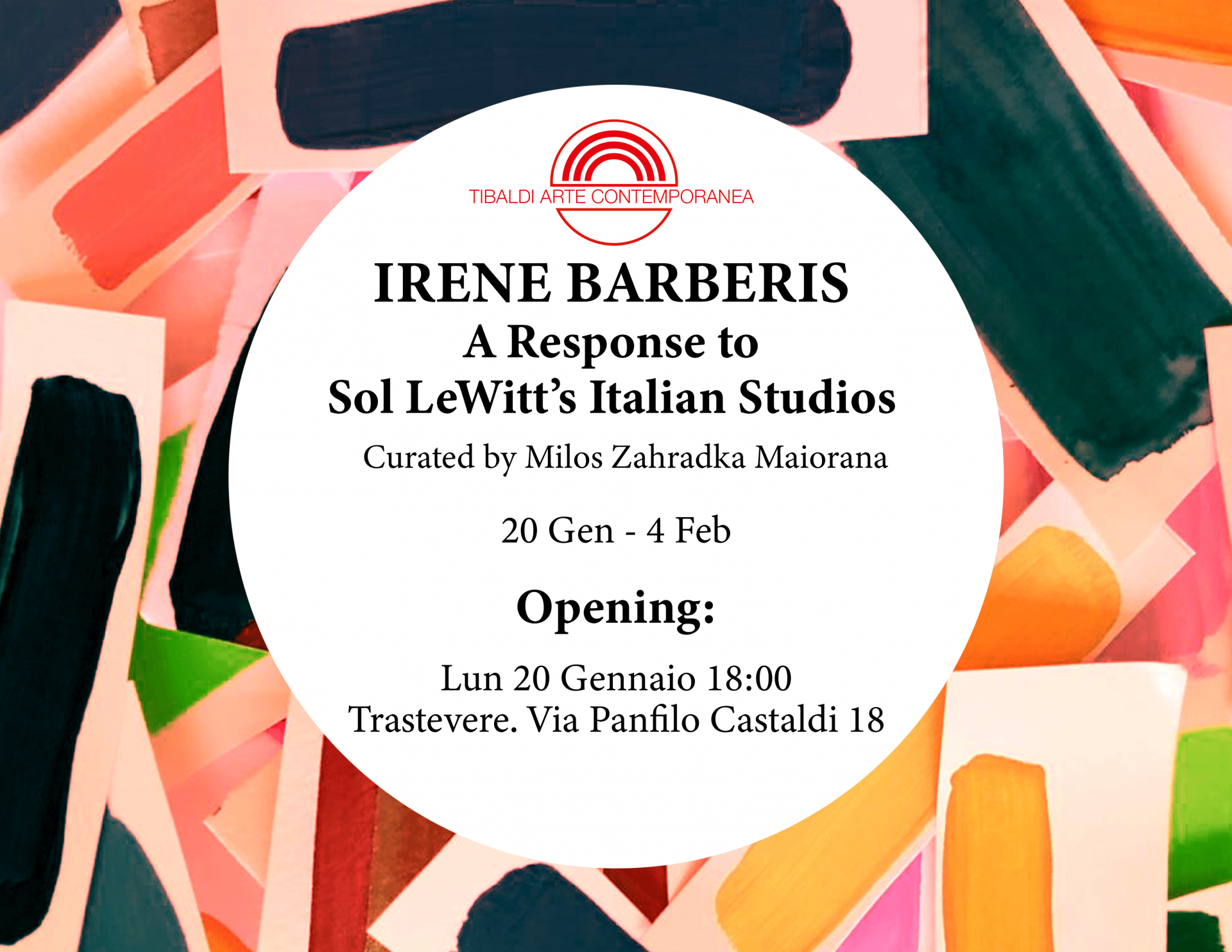 In questa mostra esclusiva, la prima in assoluto a Roma, Tibaldi Arte Contemporanea presenta una mostra-riflesso tra Irene Barberis e gli spazi creativi del celebre artista concettuale americano Sol LeWitt. Barberis è la prima artista a livello mondiale che ha potuto confrontarsi in un dialogo creativo nei luoghi Italiani dove LeWitt meditava e creava a passo con la musica.