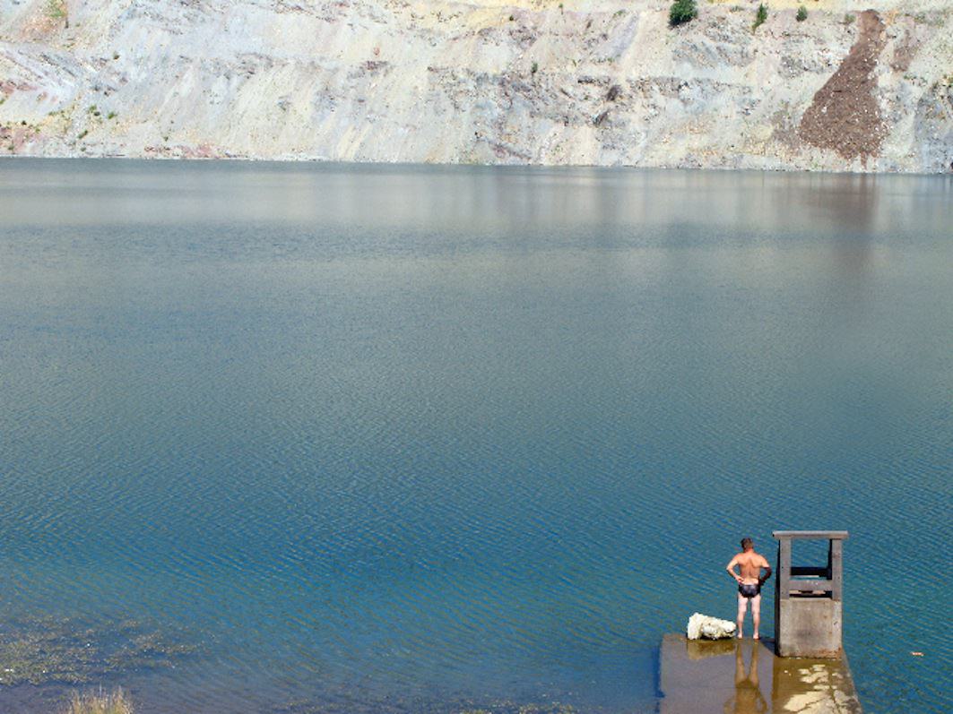 L'uomo in costume da bagno è di spalle, in piedi sul pontile di pietra. Noi lo osserviamo da distante, dall'alto. L'uomo, con le mani appoggiate sui fianchi, osserva il placido specchio d'acqua, delimitato da un muro di roccia calcarea che scende a perpendicolo dal bordo superiore dell'immagine. Forse, tra un momento si tufferà, scomparendo per un istante sotto la superficie dell'acqua. In questo scatto, che possiamo solo immaginare, osserveremmo il pontile deserto proteso sul bacino desolato, chiuso dal suo orizzonte bianco di roccia. Guardando la fotografia con maggiore attenzione abbiamo, tuttavia, l'impressione che il tuffo sia già avvenuto, e che l'uomo sia risalito sul pontile e ora osservi quel suo passato prossimo in cui si è immerso nell'acqua del bacino. E, stranamente, ci sembra che, in questa prospettiva rivolta verso il passato, il tempo interno della fotografia ci proietti in una zona di invisibilità più grande e più profonda di quella nella quale siamo prima penetrati con l'immaginazione. Come se l'aldilà, insondabile e inimmaginabile, che attende il tuffatore di Paestum, nel caso del tuffatore bosniaco di Irene Rubiano, fotografato sulle sponde di un lago artificiale presso Vareš, fosse già avvenuto.
