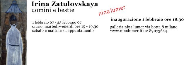 Giovedì 1 febbraio 2007 la galleria Nina Lumer inaugura la prima mostra personale in Italia di Irina Zatulovskaya. La mostra Uomini e bestie è la nuova tappa, cui faranno seguito nel corso del 2007 le personali di Oleg Kulik e Valery Koshlyakov, del programma espositivo della galleria Nina Lumer che da un anno propone al pubblico italiano uno sguardo sugli sviluppi dell'arte contemporanea russa e dei territori dell’ex Unione Sovietica, esponendone i maggiori e più eterogenei rappresentanti.
