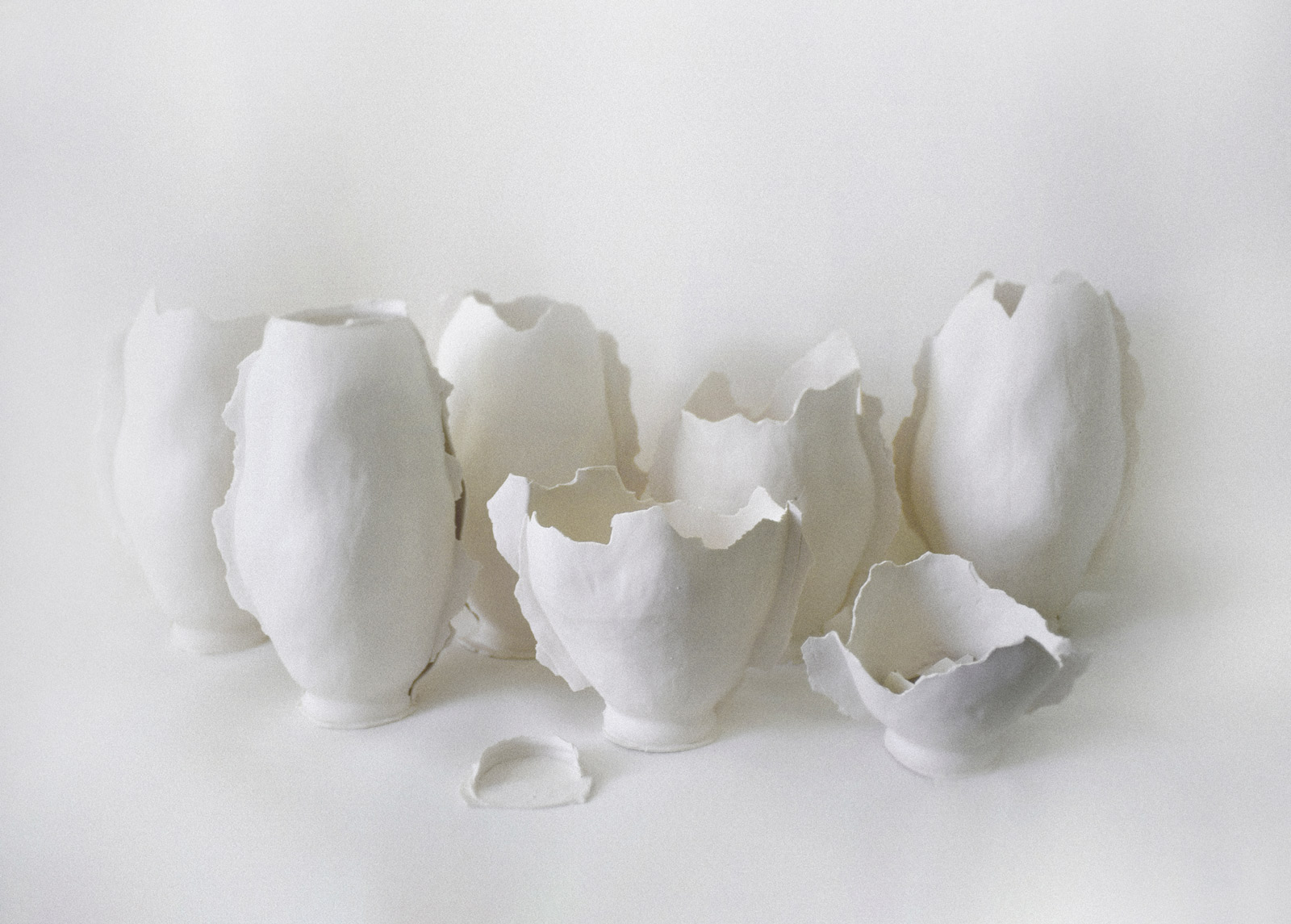 Le linee di faglia, che segnano non solo la materia ma anche l'anima degli oggetti, nelle mani dell'artista si trasformano in tracce preziose: le porcellane - nelle forme originarie di vasi e piatti - sono intenzionalmente frantumate per poter essere ricomposte grazie all'uso del filo di lino, che sostituisce qui l'oro della tradizione giapponese del kintsugi. Filo e ricucitura rappresentano una vera e propria dichiarazione estetica, creando un nuovo vocabolario visivo, dove ogni giunzione diventa un momento di bellezza e occasione di contemplazione sul carattere transitorio di ogni esistenza.