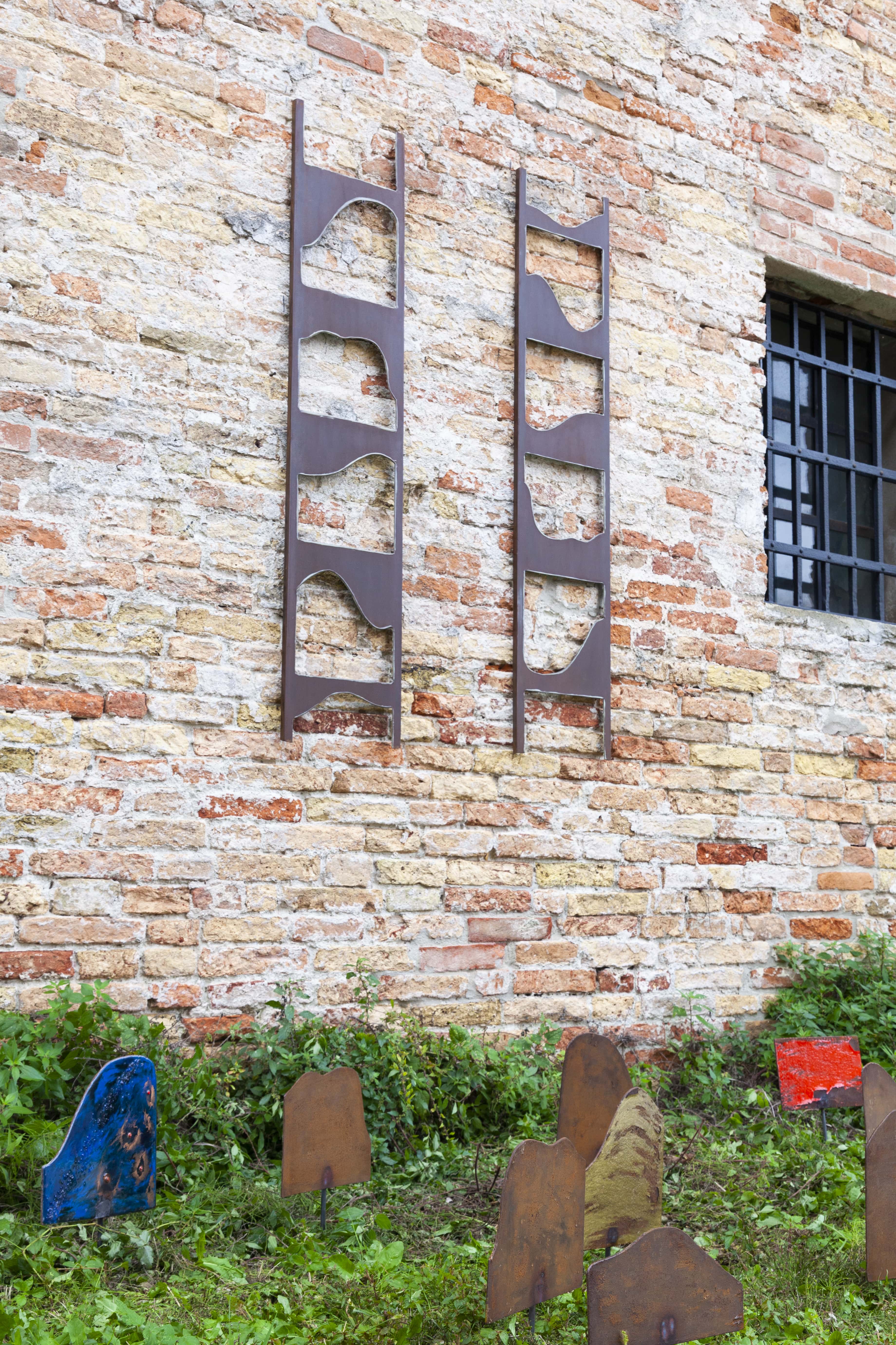 La nuova installazione, dunque, è il risultato di questa analisi tramutata attraverso una sintetizzazione concettuale delle forme: due scale collocate su di un muro, ricreate dallo smembramento di sagome di ferro.