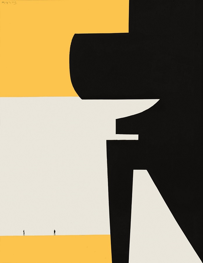 Paesaggi inospiti presenta alcune tra le opere appartenenti al ciclo pittorico più recente dell’artista, costituito da geometrie astratte e campiture piatte, colori primari e una presenza umana che appare quasi soffocata. Le figure sono ridotte a linee essenziali, pure forme primarie che compongono scenari spietati, freddi, inospitali o, come li definisce l’artista, inospiti. L’uomo è una sagoma nera, minuscola, privo di un’identità definita, immobile e disorientato, solitario in una spazialità nevrotica e ostile in cui l’alienazione del contemporaneo diviene percettibile.