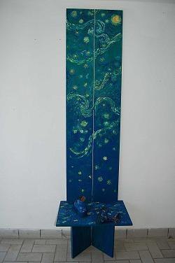 Si tratta di composizioni e di colorate installazioni oniriche, dense d’empatie creative, di segni volanti e di sogni allettanti, che si configurano come una volontaria evasione fantastica. Flussi cromatici e sonorità visive che raccolgono stupori quotidiani e ricordi atavici.