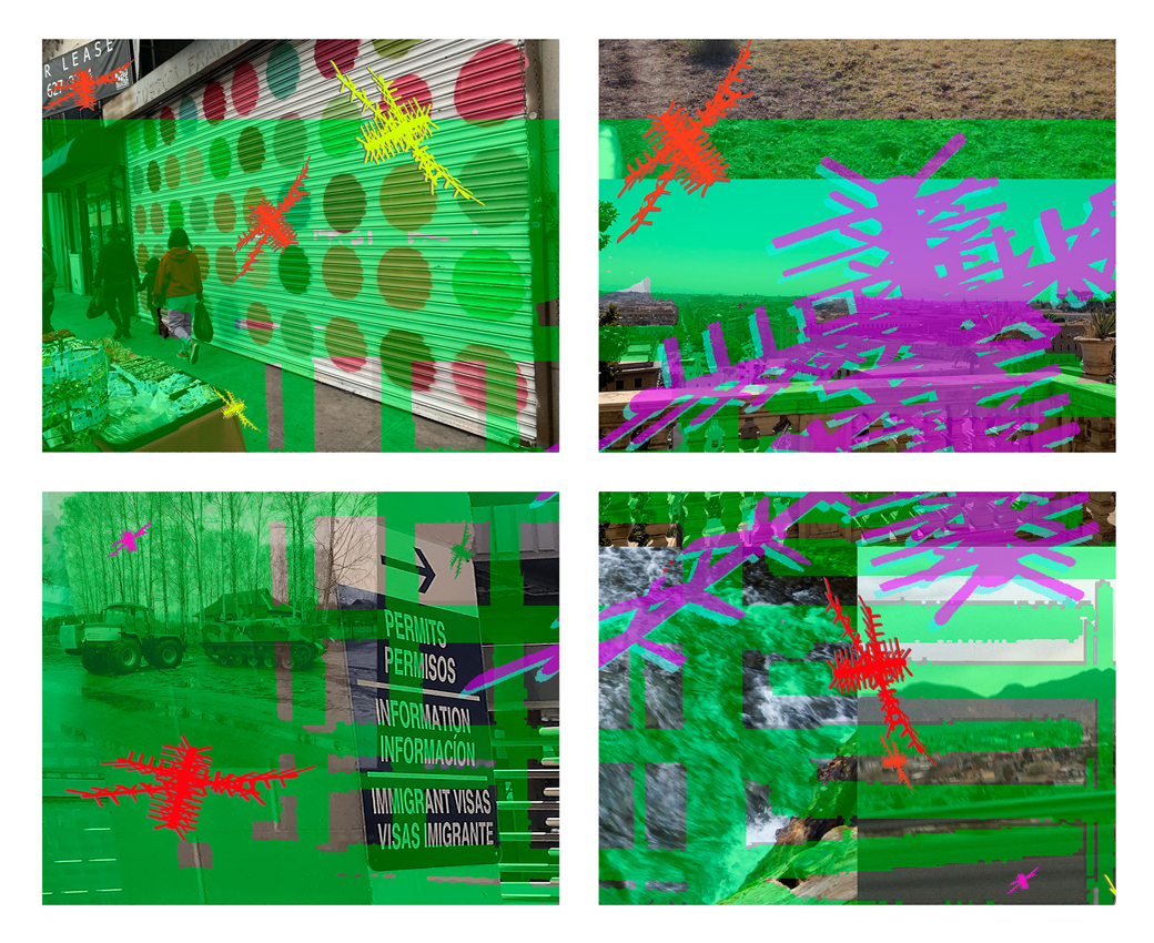 L’installazione utilizza la tecnologia digitale, indaga su territorializzazione/riterritorializzazione/deterritorializzazione, con immagini del gateway USA/Messico