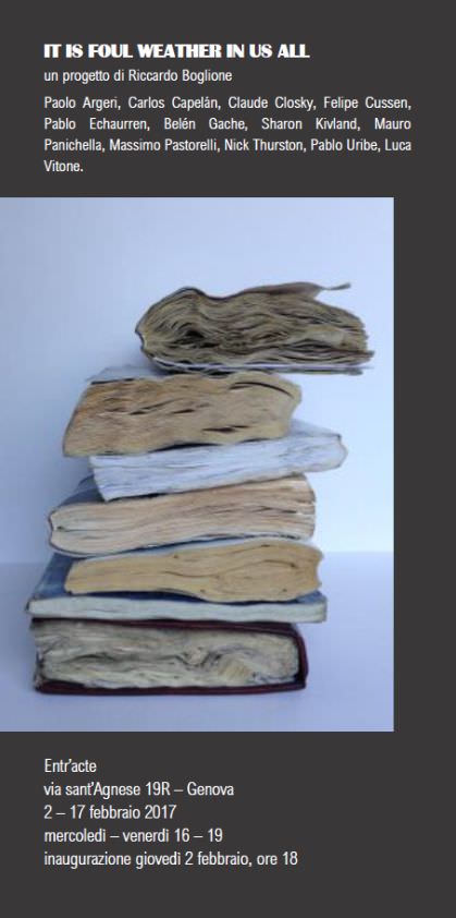Messa in scena di un progetto di letteratura concettuale che ha come obiettivo finale la pubblicazione di un libro, It is foul weather in us all riunisce 11 copie de La tempesta di Shakespeare “lavorate” secondo le istruzioni di Riccardo Boglione da altrettanti artisti sparsi fra l’Europa e le Americhe.