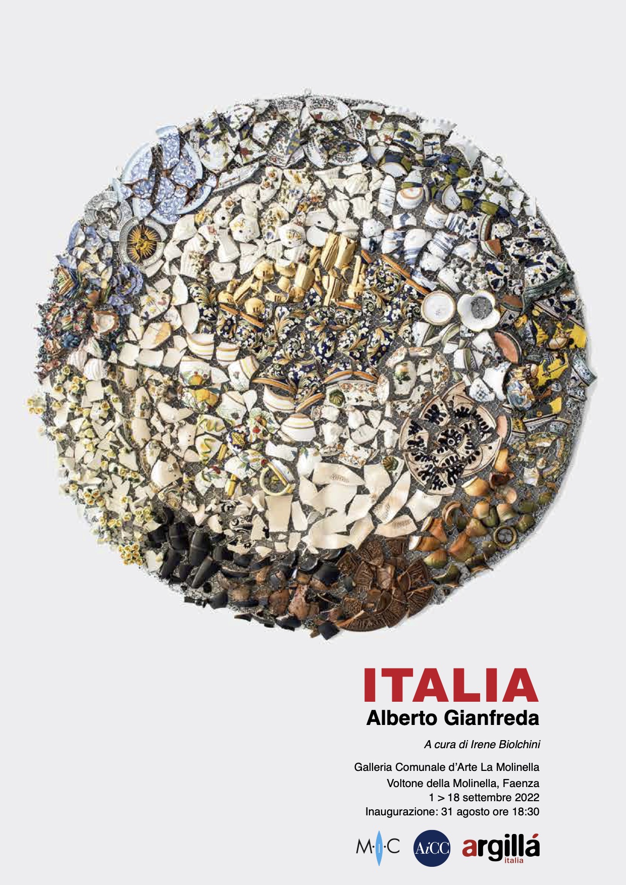 Nell’anno del ritorno di Argillà presso la Galleria Comunale della Molinella viene presen- tata l’opera ITALIA, nata da un processo partecipativo coordinato da AiCC Associa- zione Italiana Città della Ceramica. Grazie all'azione di AiCC, sono stati inviate all’artista ceramiche provenienti da 21 differenti città per 11 regioni, che sono state poi sapiente- mente rotte in frammenti, attraverso un processo mirato e ragionato, e successivamente rias- semblati per comporre il grande mosaico che dona vita a ITALIA. Descrivendo l’opera è Irene Biolchini, curatrice della mostra, a scrivere: «