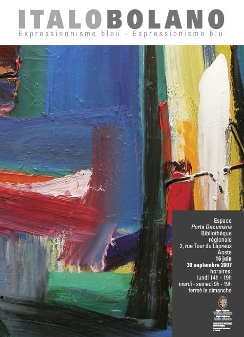 L’Assessore all’Istruzione e Cultura, Laurent Viérin, inaugurerà alle ore 18 di venerdì 15 giugno prossimo, all’Espace Porta Decumana della Biblioteca regionale di Aosta, la mostra Italo Bolano. Espressionismo blu.