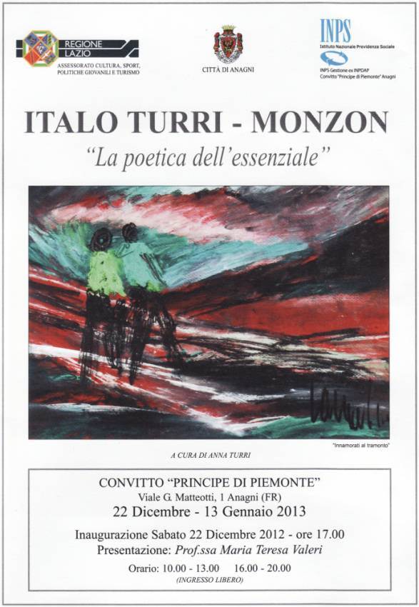 Italo Turri, in arte detto “Monzon” (Anagni, 1926-1995), è uno straordinario pittore anagnino, che ha lasciato nei suoi dipinti e collage, realizzati con deciso segno espressionista, la semplice e vigorosa denuncia contro il male del secolo XX: l’emarginazione e il tragico disagio dell’uomo, schiacciato dalle leggi dell’egoismo e dell’“apparire”. Esse sono una potente denuncia della logica disumana della società consumistica e materialista.
