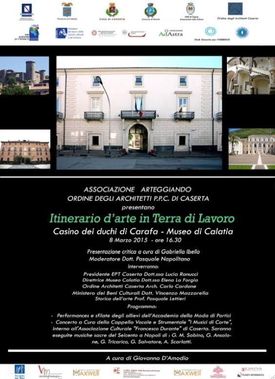 Non si è ancora conclusa la terza tappa della collettiva d’arte “Itinerario d’Arte in Terra di Lavoro”, ospitata presso il Museo Campano di Capua, in mostra fino a venerdì 6 marzo, che già si prepara la prossima esposizione, che si terrà dall’8 al 22 marzo 2015 presso il Museo di Calatia di Maddaloni (CE). La collettiva d’arte itinerante realizzata dall’Associazione Arteggiando, in collaborazione con l’Ordine degli Architetti di Caserta, ha già riscosso un notevole successo di pubblico, registrando un numero crescente di visitatori nelle tappe precedenti che hanno visto protagonisti anche il Borgo di Riardo e il Castello di Casapozzano di Orta di Atella. Curatrice dell’iniziativa è l’Arch. Giovanna D’Amodio, presidente dell’Associazione Arteggiando. Il progetto “Itinerario d’arte in Terra di Lavoro”, della durata complessiva di nove mesi, si propone di portare all’attenzione di un vasto pubblico, attraverso un’esposizione d’arte unica nel suo genere, dimore baronali e antichi castelli presenti sul territorio provinciale e recentemente recuperati con lo sforzo di privati ed enti pubblici, attraverso interventi di restauro e conservazione architettonica. Il percorso è finalizzato, quindi, sia alla promozione dell’arte contemporanea sia alla valorizzazione del patrimonio architettonico della provincia di Caserta, attraverso esposizioni pittoriche all’interno di siti ricchi di fascino e storia, dai quali si è tratto spunto per il tema della rassegna, che intende vivificare la memoria e le testimonianze del passato di questa terra. Il vernissage di questa nuova esposizione si terrà domenica 8 Marzo 2015, alle ore 16,30, presso il secondo piano del Museo di Calatia, oggetto di un recente progetto di recupero. Sono previsti gli interventi di: Elena La Forgia, Direttrice Museo Calatia; Lucia Ranucci, Presidente EPT Caserta; Carlo Cardone, Ordine Architetti Caserta; Vincenzo Mazzarella, Soprintendenza Beni Culturali; Pasquale Lettieri, Storico dell’arte. La presentazione critica sarà a cura dello storico dell’arte Gabriella Ibello. Moderatore dell’incontro il giornalista Pasquale Napolitano. Al termine della presentazione sarà possibile assistere a performances e sfilate degli allievi dell’Accademia della Moda di Portici e al concerto a cura della Cappella Vocale e Strumentale "I Musici di Corte", interna all'Associazione Culturale "Francesco Durante" di Caserta. Per l’occasione saranno eseguite musiche sacre del Seicento a Napoletano, in particolare di G. M. Sabino, G. Ansalone, G. Tricarico, G. Salvatore, A. Scarlatti. Il progetto “Itinerario d’Arte in Terra di Lavoro” si concluderà presso il Complesso Monumentale di San Leucio (24 maggio -2 giugno 2015 ).