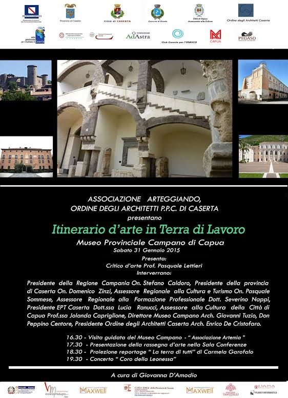 Continua il viaggio del progetto “Itinerario d’Arte in Terra di Lavoro”, la mostra d’arte itinerante realizzata dall’Associazione Arteggiando, in collaborazione con l’Ordine degli Architetti di Caserta, che sarà ospitata presso il Palazzo Antignano, sede del Museo Provinciale Campano di Capua, dal 31 gennaio al 6 marzo 2015. La mostra collettiva, che vede la partecipazione di numerosi artisti del panorama nazionale e internazionale, è già stata esposta presso il Borgo di Riardo e il Castello di Casapozzano di Orta di Atella. Curatrice dell’iniziativa è l’Arch. Giovanna D’Amodio, presidente dell’Associazione Arteggiando. Il progetto “Itinerario d’arte in Terra di Lavoro”, della durata complessiva di nove mesi, si propone di portare all’attenzione di un vasto pubblico, attraverso un’esposizione d’arte unica nel suo genere, dimore baronali e antichi castelli presenti sul territorio provinciale e recentemente recuperati con lo sforzo di privati ed enti pubblici, attraverso interventi di restauro e conservazione architettonica. Il percorso è finalizzato, quindi, sia alla promozione dell’arte contemporanea sia alla valorizzazione del patrimonio architettonico della provincia di Caserta, attraverso esposizioni pittoriche all’interno di siti ricchi di fascino e storia, dai quali si è tratto spunto per il tema della rassegna, che intende vivificare la memoria e le testimonianze del passato di questa terra. Il vernissage di questa nuova esposizione si terrà sabato 31 gennaio e vedrà gli interventi, a partire dalle ore 17,30, di: Stefano Caldoro, Presidente Regione Campania; Domenico Zinzi, Presidente Provincia di Caserta; Pasquale Sommese, Assessore Regionale alla Cultura e al Turismo; Severino Nappi, Assessore Regionale alla Formazione Professionale; Lucia Ranucci, Presidente EPT Caserta; Jolanda Capriglione, Assessore alla Cultura della Città di Capua; Giovanni Tuzio, Direttore Museo Campano; Don Giuseppe Centore, Teologo; Enrico De Cristofaro, Presidente Ordine degli Architetti di Caserta. Presenterà l'incontro il Prof. Pasquale Lettieri, mentre a moderare sarà Carmela Maietta, giornalista de Il Mattino.