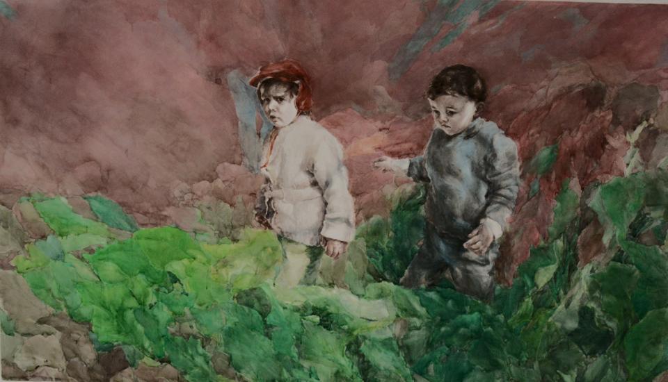 Nei primi due lavori i soggetti sono un bambino e una bambina (il figlio dell’artista ed una bambina amica) collocati in un paesaggio di piante a grandi foglie, sospesi in un loro mondo autonomo. Il terzo ha come soggetto solo le foglie, uno scenario di natura impenetrabile appena stato testimone di una rivelazione, di un accadimento, una scena che riporta alla mente il parco inquietante di Blow-up di antonioniana memoria. Mentre il quarto della serie ripropone il soggetto iniziale cambiando però la figura della bambina accanto al figlio dell’artista con l’artista stessa, riportata alla sua età, in un tempo senza estensione. Le grandi dimensioni degli acquerelli riproducono le dimensioni a grandezza naturale dei bambini, a suggerire attraverso la loro presenza quasi fisica la loro autonomia.