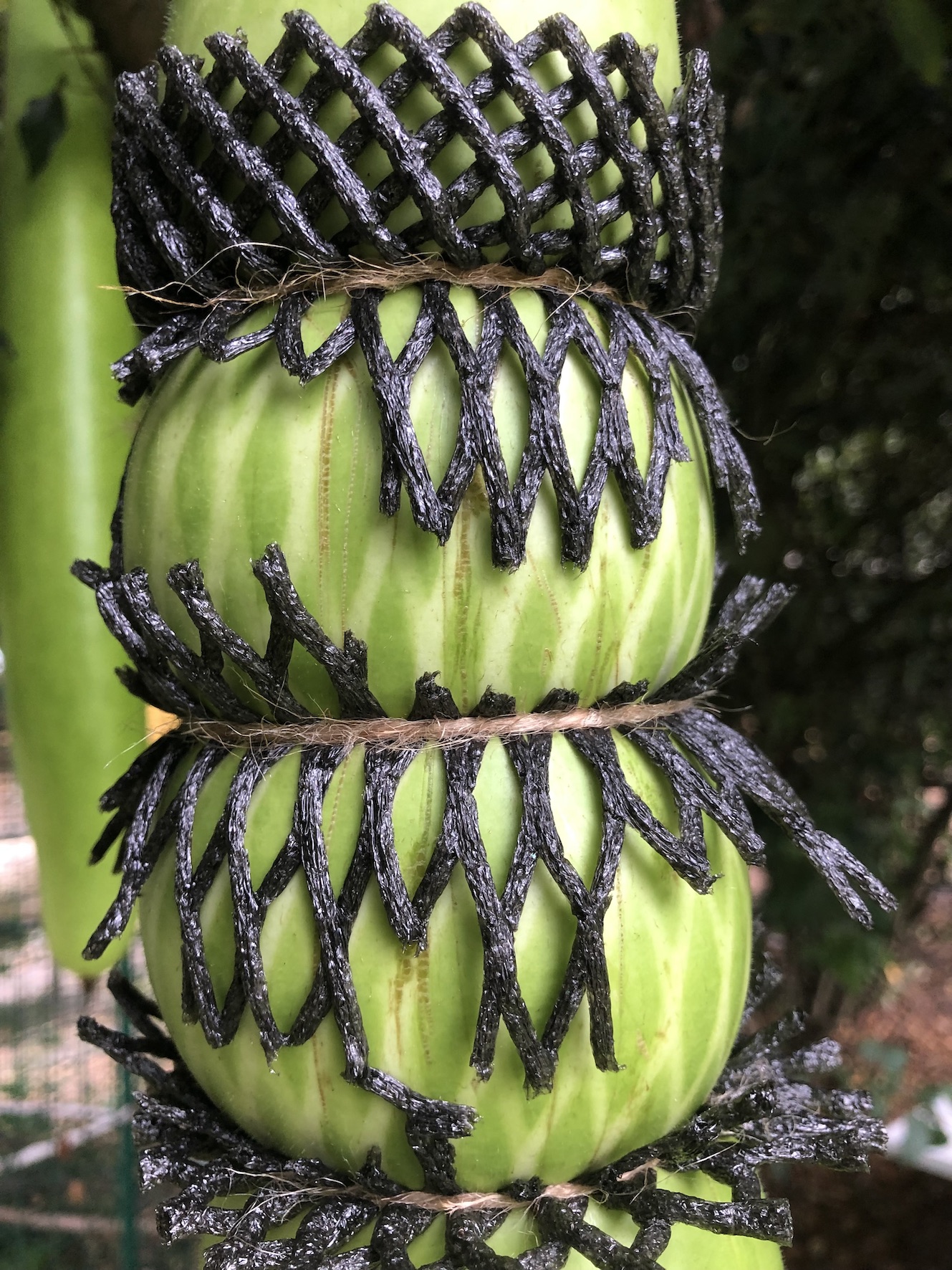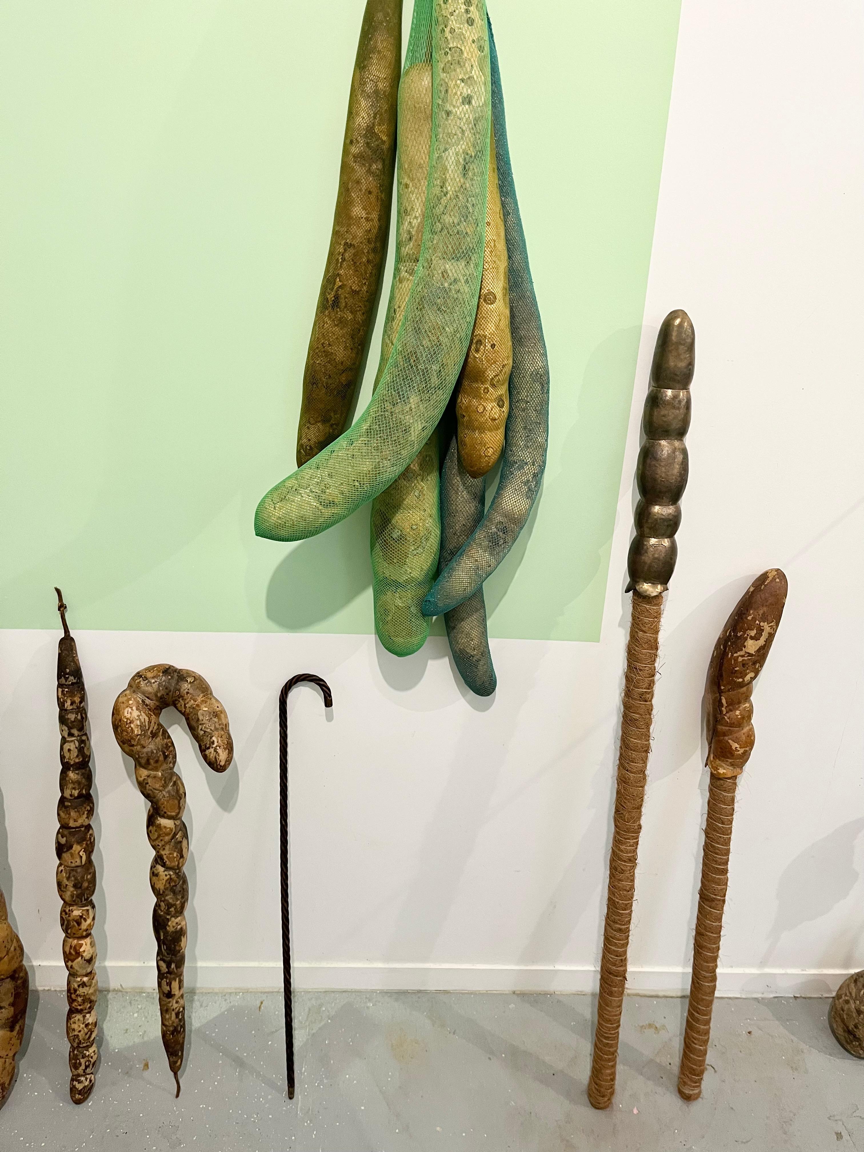 L’artista spiega: “Coltivando diverse varietà di zucche (lagenaria siceraria), osservo le differenti reazioni che questi frutti manifestano in risposta alle limitazioni imposte (corde, vari scarti di imballaggi protettivi, rifiuti di oggetti quotidiani). Alcune varietà resistono o addirittura spezzano questi vincoli con la loro forza di crescita, mentre altre si adattano al vincolo e si ‘auto-scolpiscono’ attraverso di esso.”