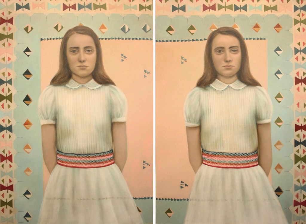 La sapiente pittura di Ivana Bukovac incornicia l’immagine tra gli arcaici simboli che l’autrice dimostra di conoscere bene e in questo contesto di voler citare. Nel suo caso, inoltre, l’utilizzo di una proposta frontale dei ritratti che tanto ricordano in una resa formale contemporanea, le antiche icone della tradizione bizantina, così care, ad esempio, seppure in una proposta cromatica