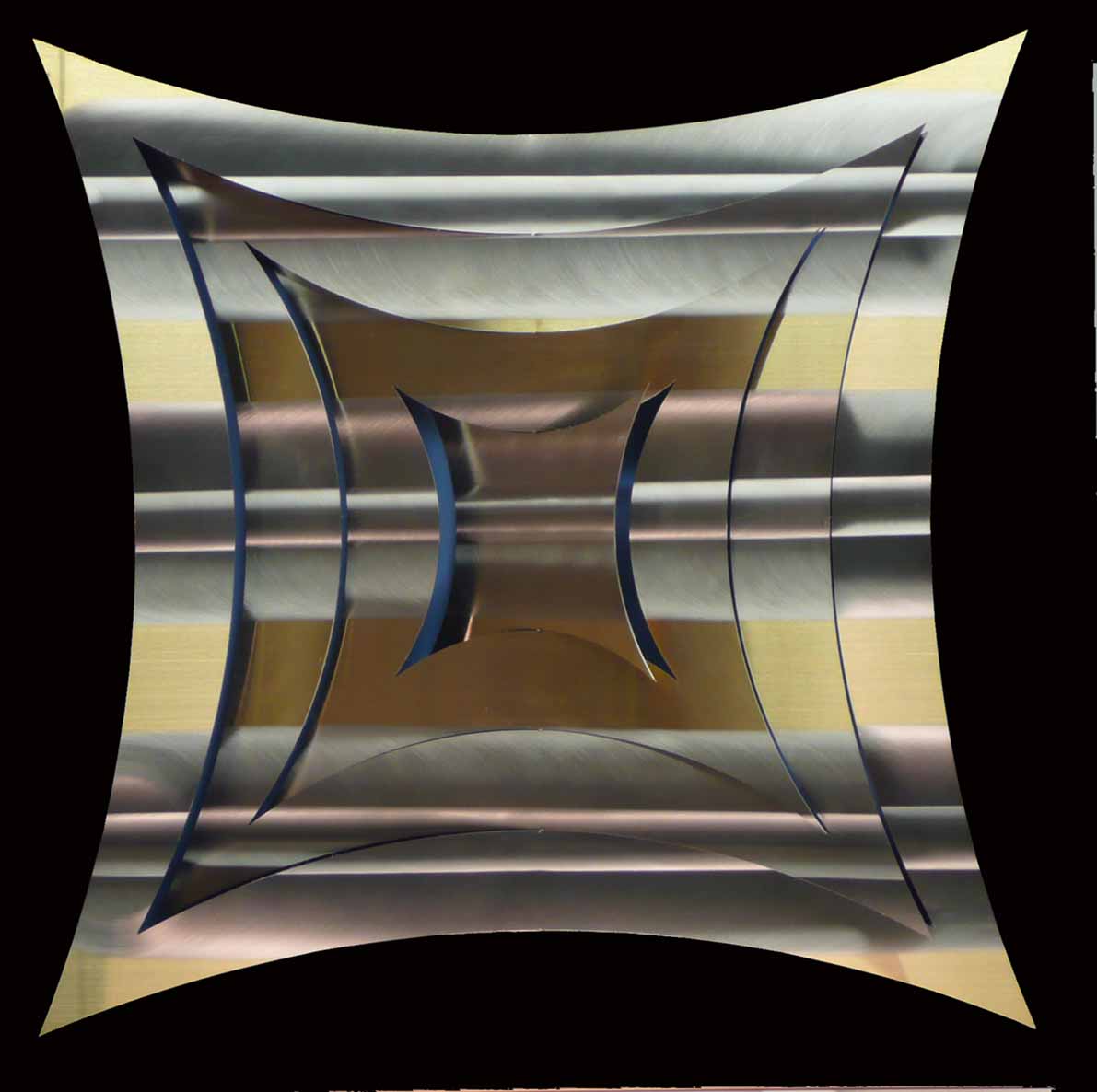 È nelle sequenze modulari delle abrasioni e nei salti di livello, che si producono improvvisi brillamenti e movimenti percettivi, secondo i molteplici angoli d’incidenza della luce, che trasformano la fruizione in partecipazione. L’artista, infatti, talvolta sovrappone e distanzia le superfici, talvolta sottopone l’acciaio a vere proprie torsioni, moltiplicando i piani di riflessione con una sapienza compositiva non inferiore ad alcune tra le massime esperienze dell’arte cinetica e programmata, da Nicolas Schöffer ad Alberto Biasi.