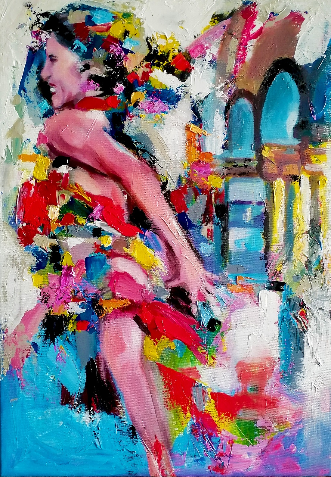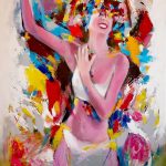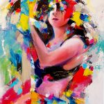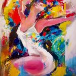 In questo meccanismo ideativo, l’artista è influenzato dalla sua attività di performer, che gli permette di attenzionare differenti ipotesi spaziali anche sulla limitata superficie di una tela. Come in “Spiraglio di libertà”, dove le movenze sinuose del soggetto rappresentato determinano un’esplosione di forme colorate dalle tonalità accese che si diramano sullo sfondo con andamento musicale.
