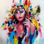 Osservando le opere in mostra si denota una predilezione per la rappresentazione della donna, che nel processo creativo di astrazione del reale diventa emblema di un’idealizzazione originata dal pensiero dell’artista. La figura femminile, come la pittura, per Petrucci è energia sacra, è icona dell’unione tra maschile e femminile, tra sacro e profano, tra forza e sensibilità. È specchio, quindi, del suo fare pittura in continuo equilibrio tra gestualità istintiva e riflessione sugli accostamenti cromatici e sulle dinamiche spaziali.