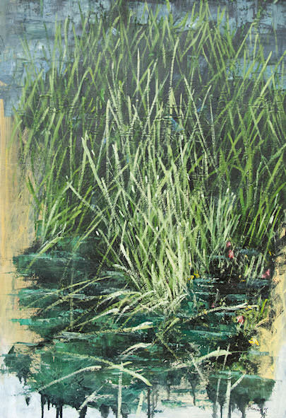 Le tele, già di per sé di dimensioni inconsuete rispetto alla pratica abituale del paesaggismo, si accampano come grandi specchi in cui, riflettendoci, ci scopriamo a stare dentro a frammenti di spazi naturali, che sono fatti di zolle di terra, acqua e arbusti. Cioè, accanto al pittore, stiamo dentro, condividiamo la sua ricerca di un contatto diretto, fatto di fisicità, di corporeità essenziale ed immediatezza percettiva dei sensi.