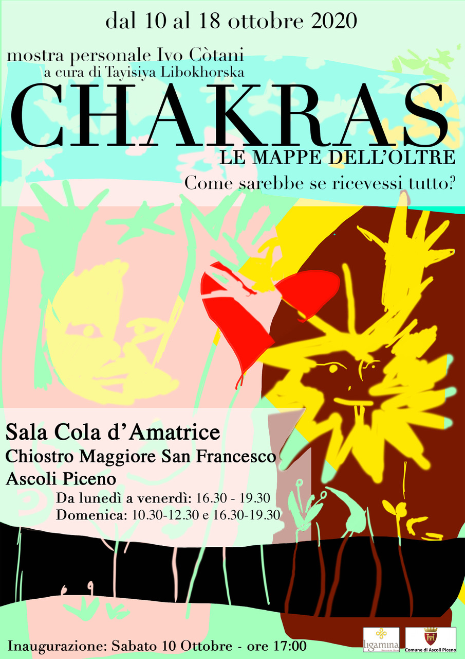 Artista poliedrico che dopo esser cresciuto artisticamente a Roma e Madrid, torna nella sua città natale con la sua quarta personale “CHAKRAS | le mappe dell’oltre”. Ad Ascoli racconterà la sua arte attraverso una dozzina di opere stampe digitali poi dipinte con smalti e acrilici. Al centro della sala si potrà ammirare anche un’istallazione volante con quattro maxi teli in PVC e la music design accompagnerà il viaggio dello spettatore.