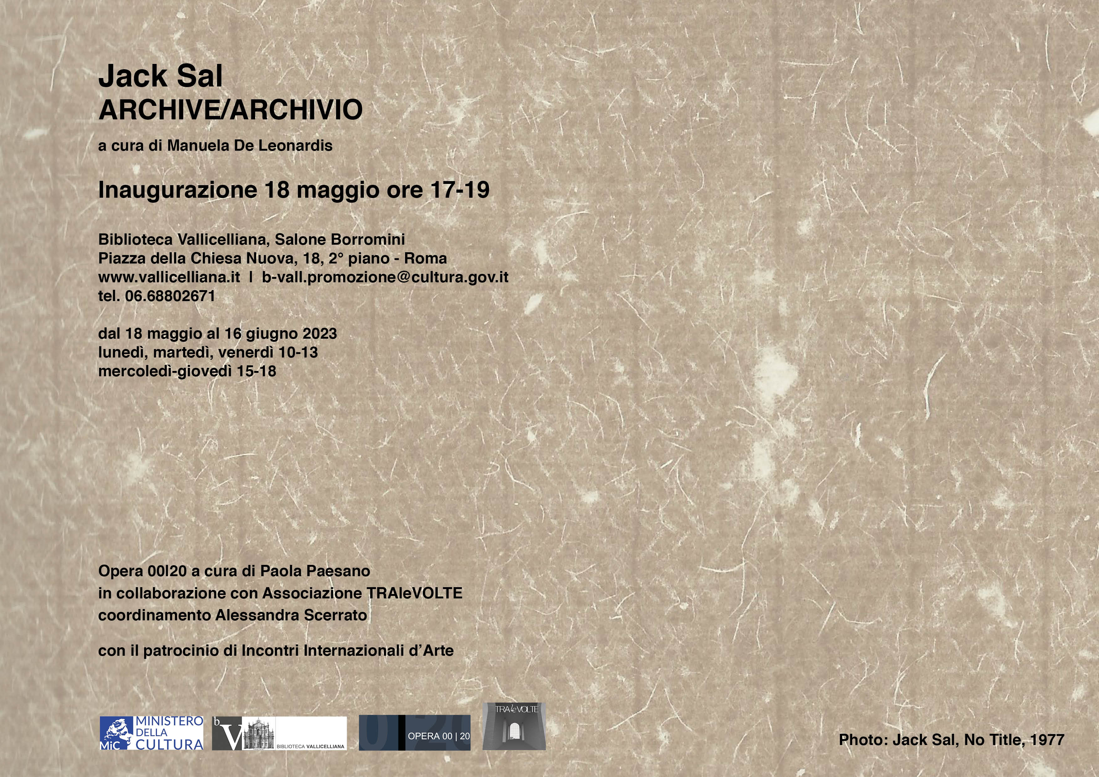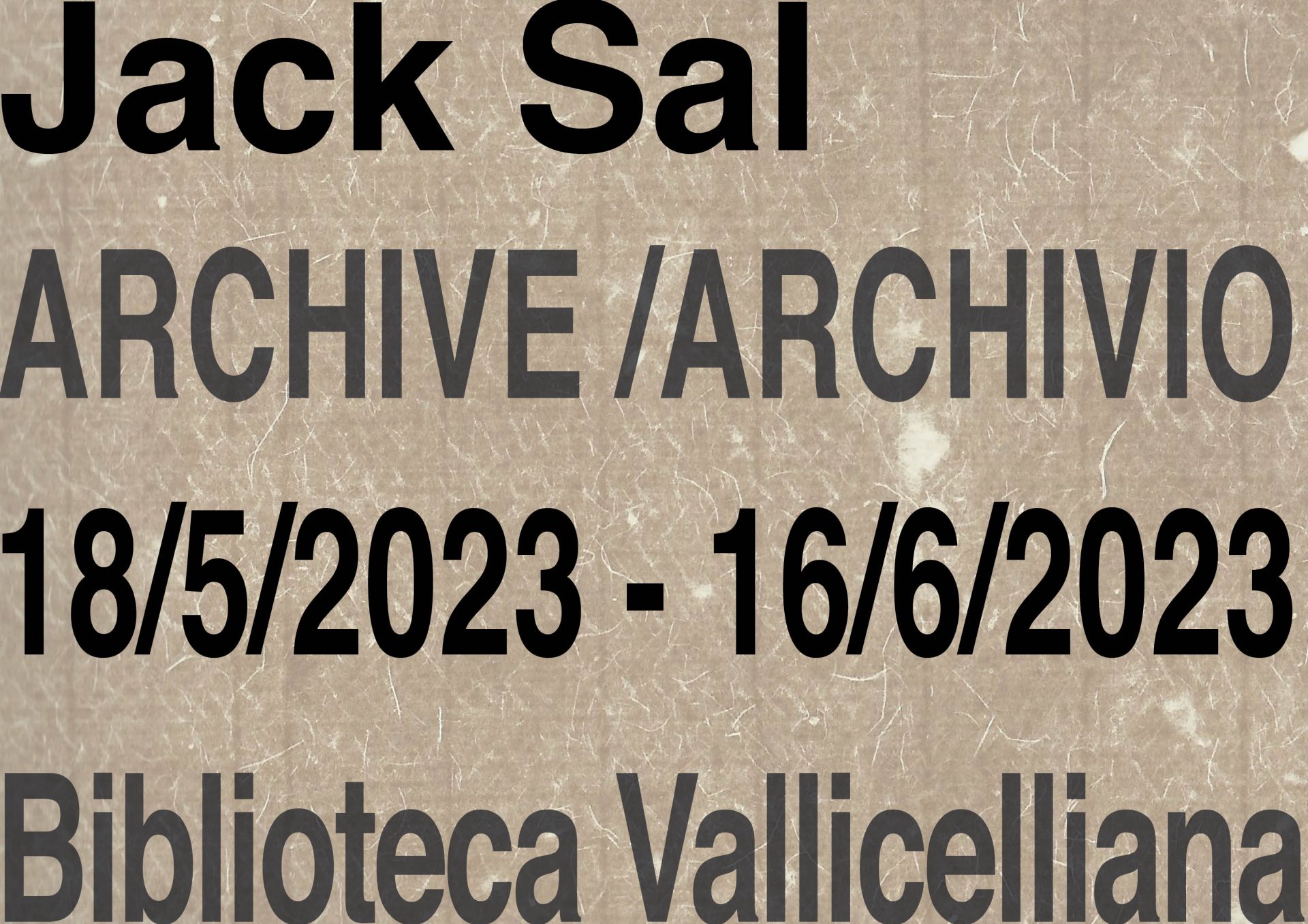 Dal 18 maggio al 16 giugno 2023 la Biblioteca Vallicelliana presenta, nel Salone Borromini, la mostra personale Jack Sal. ARCHIVE/ARCHIVIO a cura di Manuela De Leonardis, che si inserisce all’interno della rassegna Opera 00|20 a cura di Paola Paesano e si avvale del patrocinio degli Incontri Internazionali d’Arte.