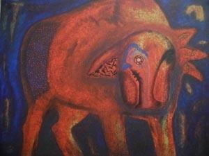I racconti pittorici di Jacobo creano una sostanza struggente, involontaria quasi al di là del tempo, o meglio, in quel tempo ritenuto magico dove l’orlo del sipario radeva il limite del mistero e lasciava danzare su le piazze magie e burlesche caricature di tempi nascosti e di vicende immemorabili. Il tempo di mezzo, quel passaggio senza limiti che dava al tempo un verso incomprensibile, ma dal ciglio lasciava intravedere il fondo della strada, dove inflessibile l’eroe aveva nel cuore una commozione impetuosa. Pitture oscure, quasi dei talismani immersi nel blu e che dal profondo riemergono in trasparenza, carichi di quei lustri e colori e gioielli arcaici che ci illudono nella sentenza del silenzio. Una pittura inconcitata, trascurante di narrazioni ma immediatamente mitica, iconografica, espressa con quel vigore madreperlato che resina la base fino a renderla meditativa, quasi a traslocare da una sostanza all’altra la materia fino a quando non si esalta in comprensione d’immagine e, a quel punto ecco uscire ogni possibile rimembranza evocativa. Le figure, le cose, i magici animali in parte si addobbano di sguardi e di luccichii e, ovunque tranne che nella facile compattezza della trama cromatica che deforma la linea, si sfidano la forma alla velata disputa tra sostanza e evanescenza; auree prive di vento e divini ornamenti senza storia che splendono nel finale della comprensione come una progressione d’effetti e di affetti, in una scena che si investe e si conchiude in un suono lento, con il canto medesimo di cetre e sirene pronte a intonarlo.