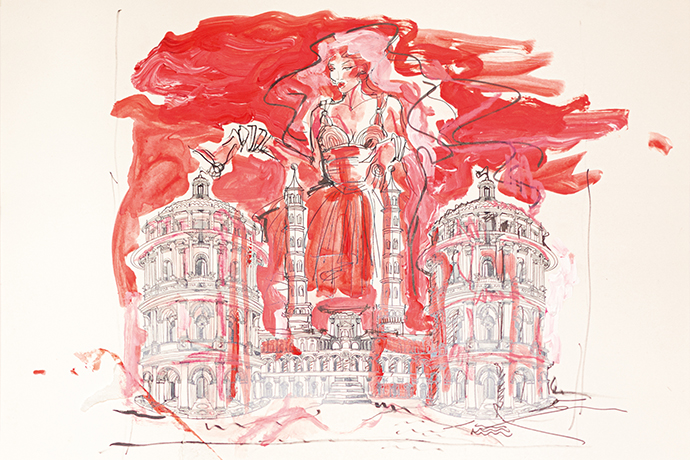Il secondo approfondimento apre un’inchiesta di studi grafici che spaziano da appunti a rappresentazioni vere e proprie su un ipotetico palazzo per la moda italiana, interrogazioni sulla sua ragion d’essere, scelte di stile dall’allure romantico e sognante traboccante di stile e buon gusto che incarnano al tempo stesso una disquisizione sull’efficacia (o meno) degli strumenti del disegno di architettura per dare un senso alla rappresentazione dei luoghi.