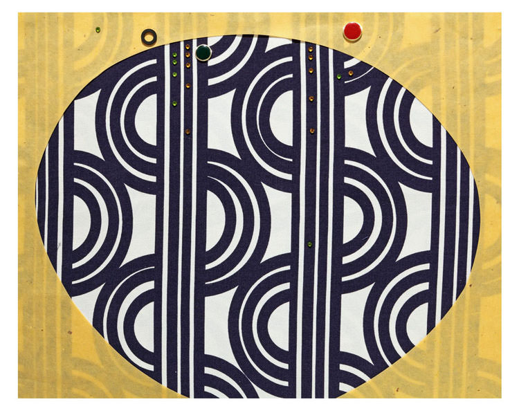 Tra gli elementi applicati sulle tele e che su di esse orbitano come pianeti, troviamo oggetti di diversa natura: tessuti e passamanerie che fanno pensare a Baj, mascherine di cartone monocromo e di forme geometriche simili a quelle utilizzate da Hans Richter nei suoi primi film sperimentali di animazione, ma anche orecchini di foggia indianeggiante e bottoni appariscenti, di dubbio se non di cattivo gusto. Dunque la storia dell’arte non fatica a combinarsi con il kitsch, di cui Prina non ha paura ma in cui anzi riconosce una componente importante della nostra cultura.