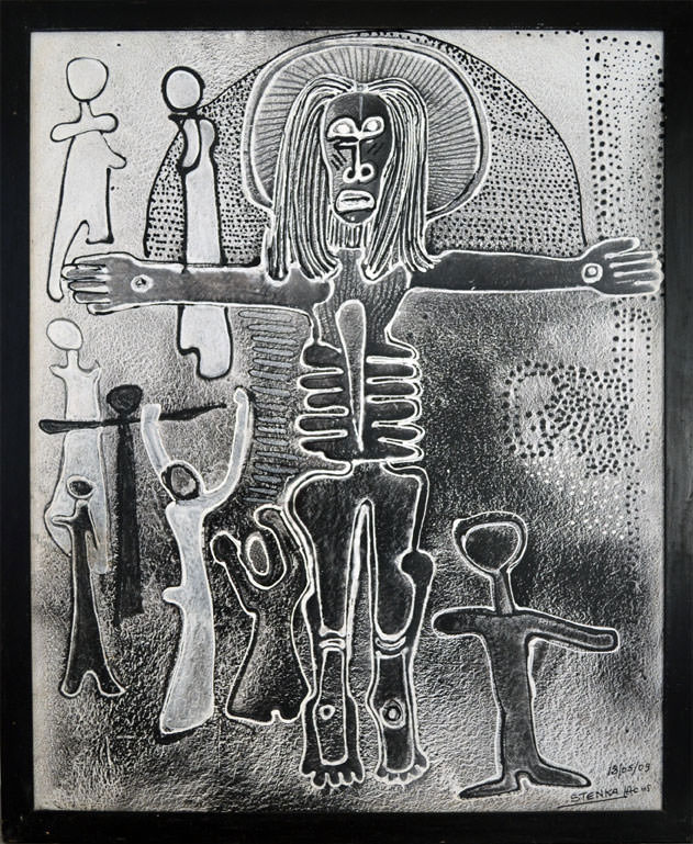I Crocifissi di Stenka, superbi e iattanti, occupano lo spazio della chiesa di San Francesco facente parte dell’omonimo Complesso Museale di Trevi. Le opere esposte hanno tutte lo stesso tema, presente anche nei disegni: l'uomo trafitto alle mani e ai piedi. Il racconto, che si snoda secondo un percorso non analogico, è affidato al vigore della linea, che accentua il senso di alta tragedia in una messa in scena dai fondamenti archetipici. Nonostante il soggetto di ascendenza prettamente occidentale, nonostante le concessioni verso l’iconografia più diffusa, il segno del pittore ivoriano, le sue anatomie, gli spazi che amministra, le integrazioni fantastiche, sono totalmente personali, africani quanto meno: vi batte l’onda perpetua dell’oceano, vi si protrae l’alito del deserto, si spande fino ai confini delle città la forza verde della natura. Tuttavia la sua arte non è permeabile nemmeno ai riferimenti figurativi più noti del continente e, si badi bene, la sua terra non è certo avara di produzioni di notevole qualità.