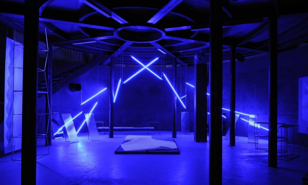 Nella mostra è illustrato il suo percorso con una carrellata di lavori in cui si nota come ricerca artistica e ricerca funzionale si sviluppano sempre “con l’attenzione ai materiali, che vengono utilizzati ben al di là delle loro consuete destinazioni. Mi riferisco qui – scrive ancora Cavadini - all’uso dei vetri lavorati e degli specchi che costituiscono elementi fondamentali di installazioni, come Glass Works, in cui l’artista sfrutta la lavorazione industriale di essi per dare corpo ad una visione fatta di vibrazioni e di variazioni originate dalla diversa incidenza della luce sulle superfici operate del vetro (spesso reso specchiante), visione che si innesta in un contesto di ricerca che ha alla base le esperienze dell’arte cinetica e dell’optical art e che trova qui una nuova declinazione. Già abbiamo accennato all’uso del neon (nella tradizionale versione bianca o in quella, più usata da Toussaint, blu cobalto) per distribuire nello spazio dei segni-segmenti grafici che possono generare percorsi o interagire con altre presenze.”