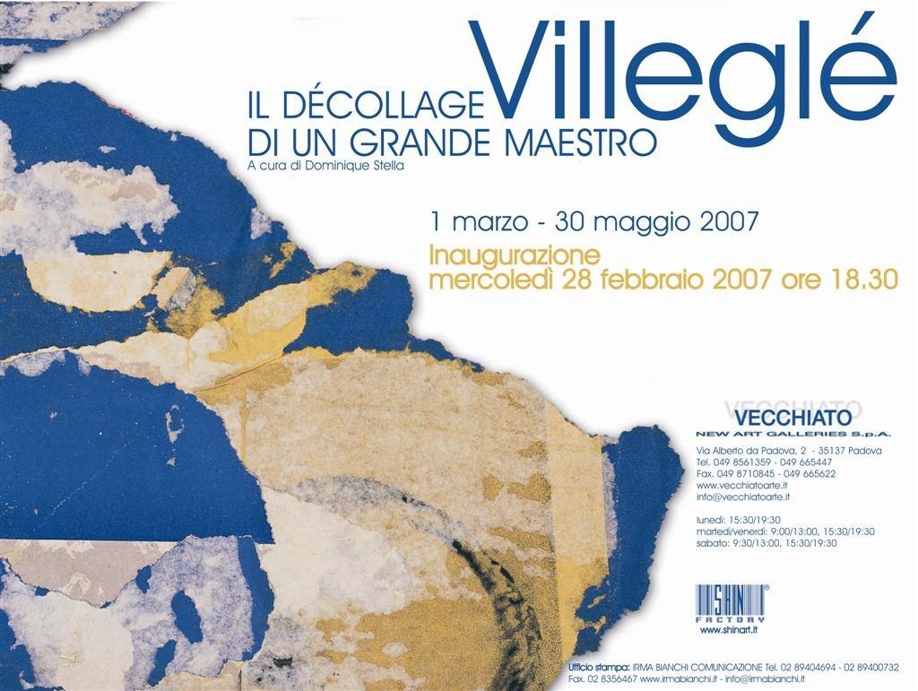 La Vecchiato New Art Galleries apre la stagione con una ricca ed esaustiva retrospettiva dedicata a Jacques Villeglé dal titolo Il décollage di un grande maestro. Villeglé, curata da Dominique Stella, comprendente diversi inediti e un'opera realizzata appositamente in occasione della mostra.