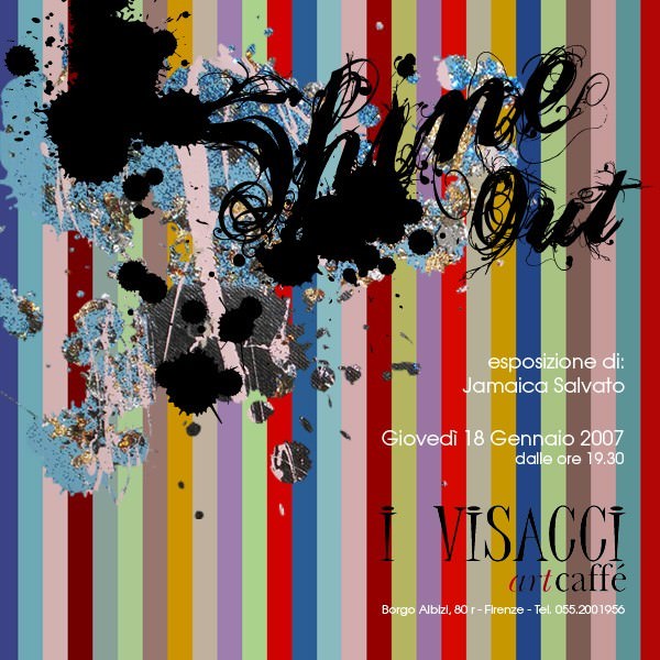 SHINE OUT nasce dall'idea di assemblare e plasmare materiali particolari: acrilici, brillantini, foglie d'oro, d'argento, di rame, mischiate con gli stucchi secondo una procedura che fa sì che si asciughino contemporaneamente. Le opere sono di grande effetto visivo con il risultato di un divertente e forte impatto cromatico. L'intento dell'artista è quello di far sposare la materia con il luccichio di carte impalpabili e brillantini che sottolineano la preziosità delle opere. La particolarità dei lavori esposti, sta nel fatto che anche se si propongono nella forma classica di quadri, sono studiati per essere dei veri e propri oggetti di design contemporaneo con un grande impatto visivo. E il primo di una serie di appuntamenti nei locali più cult di Firenze.
