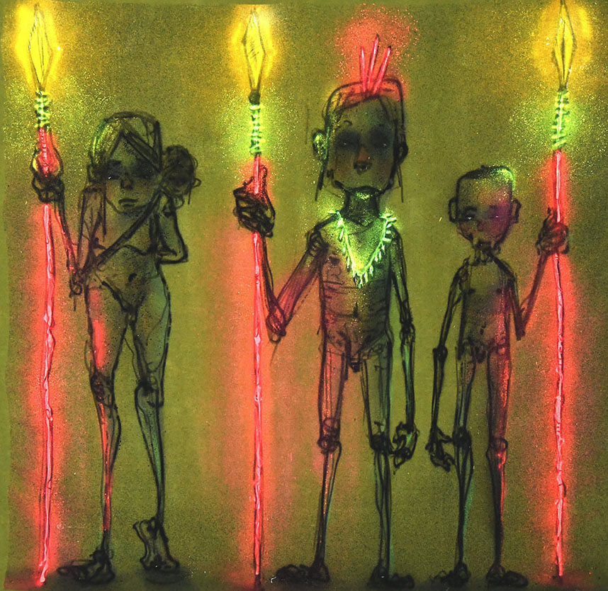 Forme, volti, sguardi dalle linee decise e poco definite riemergono da una fase di produzione artistica dichiaratamente cupa, accostate a lavori accumulati nel tempo come risultato di anni di bozzetti, disegni e opere sospese.
