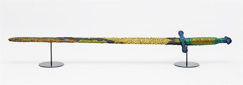 una spada in acciaio ricoperta di corazze naturali e iridescenti di scarabeo che evoca l’investitura