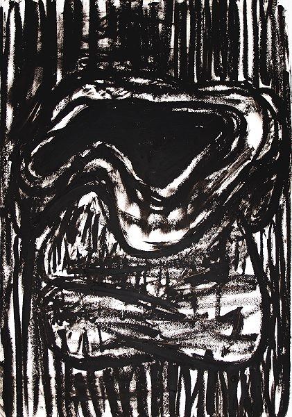 Sono pastelli ad olio neri che lasciano sulla carta un segno di consistenza grassa, bituminosa tale da poter essere facilmente scambiati per catrami. È un ripercorere su carta il cammino artistico di Kounellis. Infatti nelle opere più grandi risalta nitido il profilo del sacchi, negli altri la traccia è quello della sezione dei tronchi, oppure inconfondibile è quella dei muri o delle macchine da cucire. Niente è concesso alla piacevolezza dello sguardo mentre ci si può interrogare sul significato di quello scorrere furente e nervoso della mano sul foglio di carta. Il nero mortale contro l’allegria dei colori; Kounellis mira dritto al nocciolo del problema, al tema sul quale oggi possono arrovellarsi solo i Grandi: riuscire a rappresentare l’arte nel suo momento creativo, allo stato nascente di idea, di ispirazione senza appesantirla degli orpelli della bella ed appetibile rappresentazione e quindi solamente con l’uso di materiali poveri che la natura offre al nostro sguardo. Questa è stata la scommessa del movimento dell’Arte Povera, ma a vincerla (quasi) è stata il solo Kounellis.
