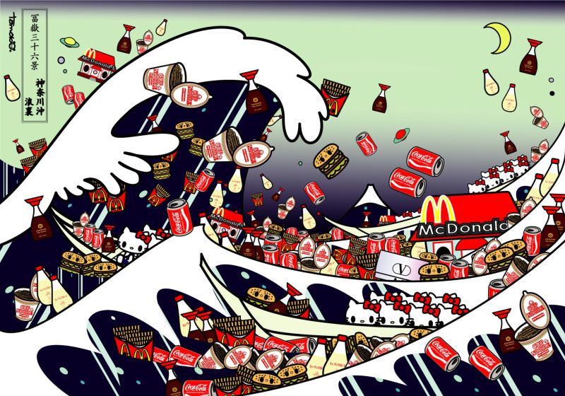 La mostra muove i passi dalla più iconica opera dell'arte giapponese, "La grande onda di Kanagawa" di Hokusai, reinterpretata qui dall'artista Tomoko Nagao. La sua versione contemporanea, intitolata “The Great Wave of Kanagawa with mc, cupnoodle, kewpie, kikkoman and kitty” è una sottile e ironica critica alla società, addolcita dall'estetica giapponese "kawaii" che rende ogni elemento carino e amorevole.