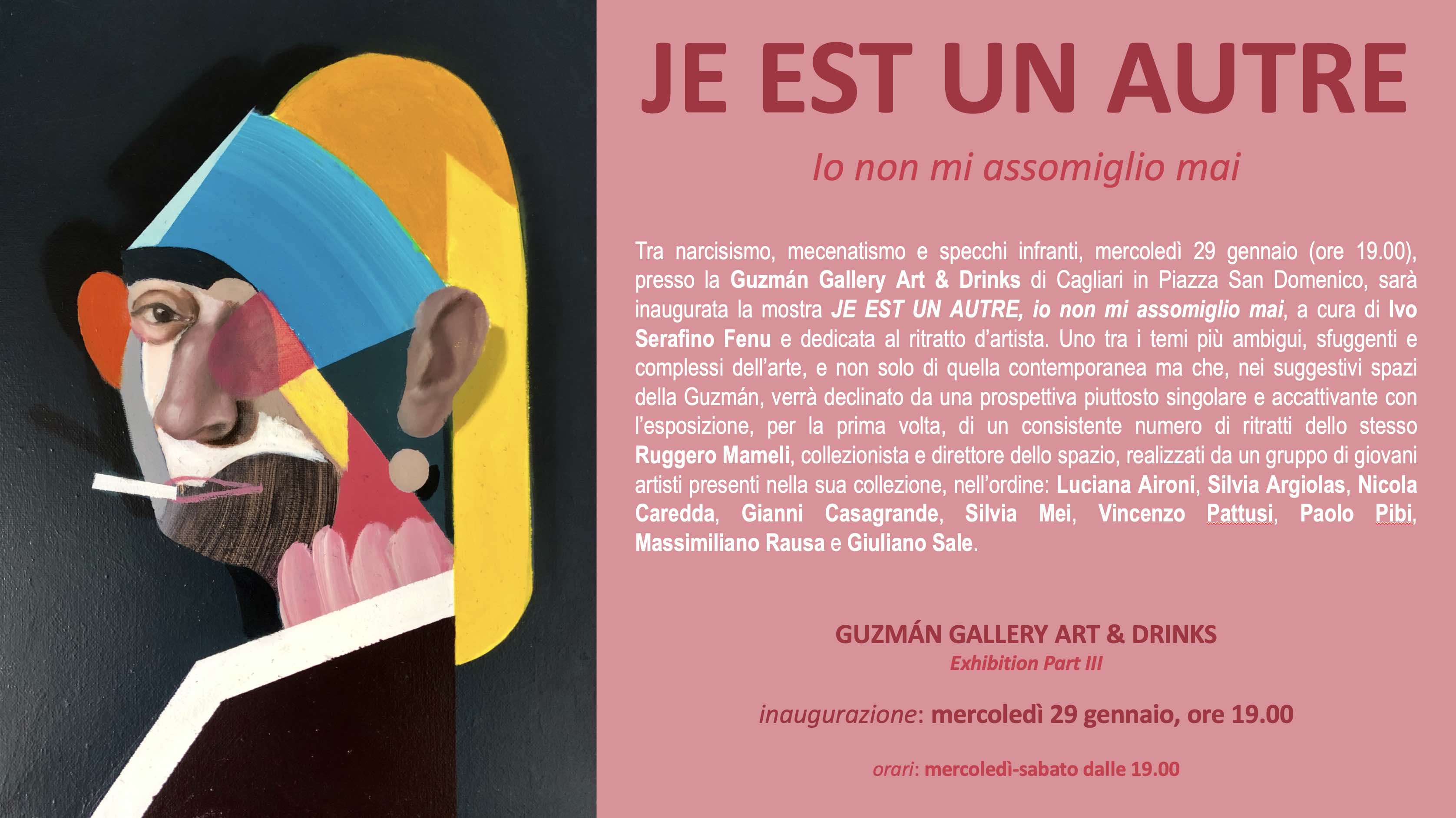 Tra narcisismo, mecenatismo e specchi infranti, mercoledì 29 gennaio (ore 19.00), presso la Guzmán Gallery Art & Drinks di Cagliari in Piazza San Domenico, sarà inaugurata la mostra JE EST UN AUTRE, io non mi assomiglio mai, a cura di Ivo Serafino Fenu e dedicata al ritratto d’artista. Uno tra i temi più ambigui, sfuggenti e complessi dell’arte, e non solo di quella contemporanea ma che, nei suggestivi spazi della Guzmán, verrà declinato da una prospettiva piuttosto singolare e accattivante con l’esposizione, per la prima volta, di un consistente numero di ritratti dello stesso Ruggero Mameli, collezionista e direttore dello spazio, realizzati da un gruppo di giovani artisti presenti nella sua collezione, nell’ordine: Luciana Aironi, Silvia Argiolas, Nicola Caredda, Gianni Casagrande, Silvia Mei, Vincenzo Pattusi, Paolo Pibi, Massimiliano Rausa e Giuliano Sale.