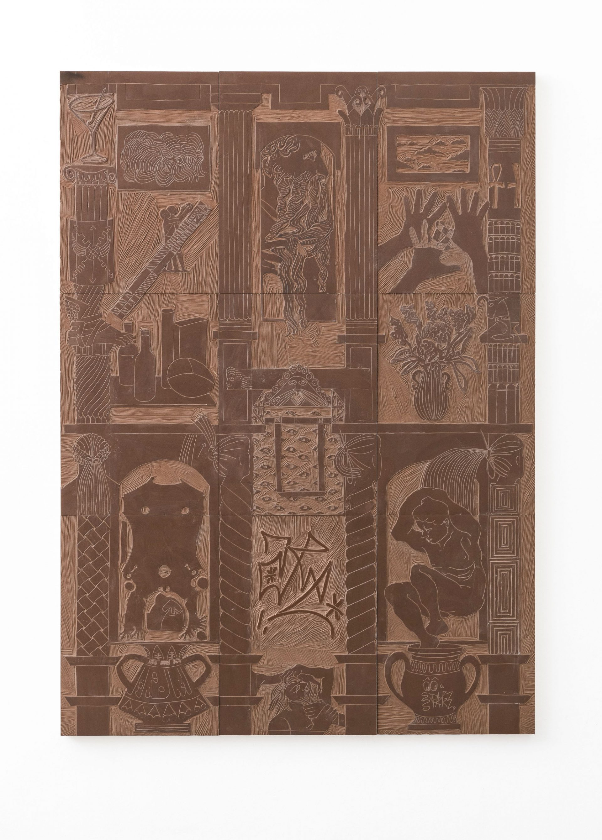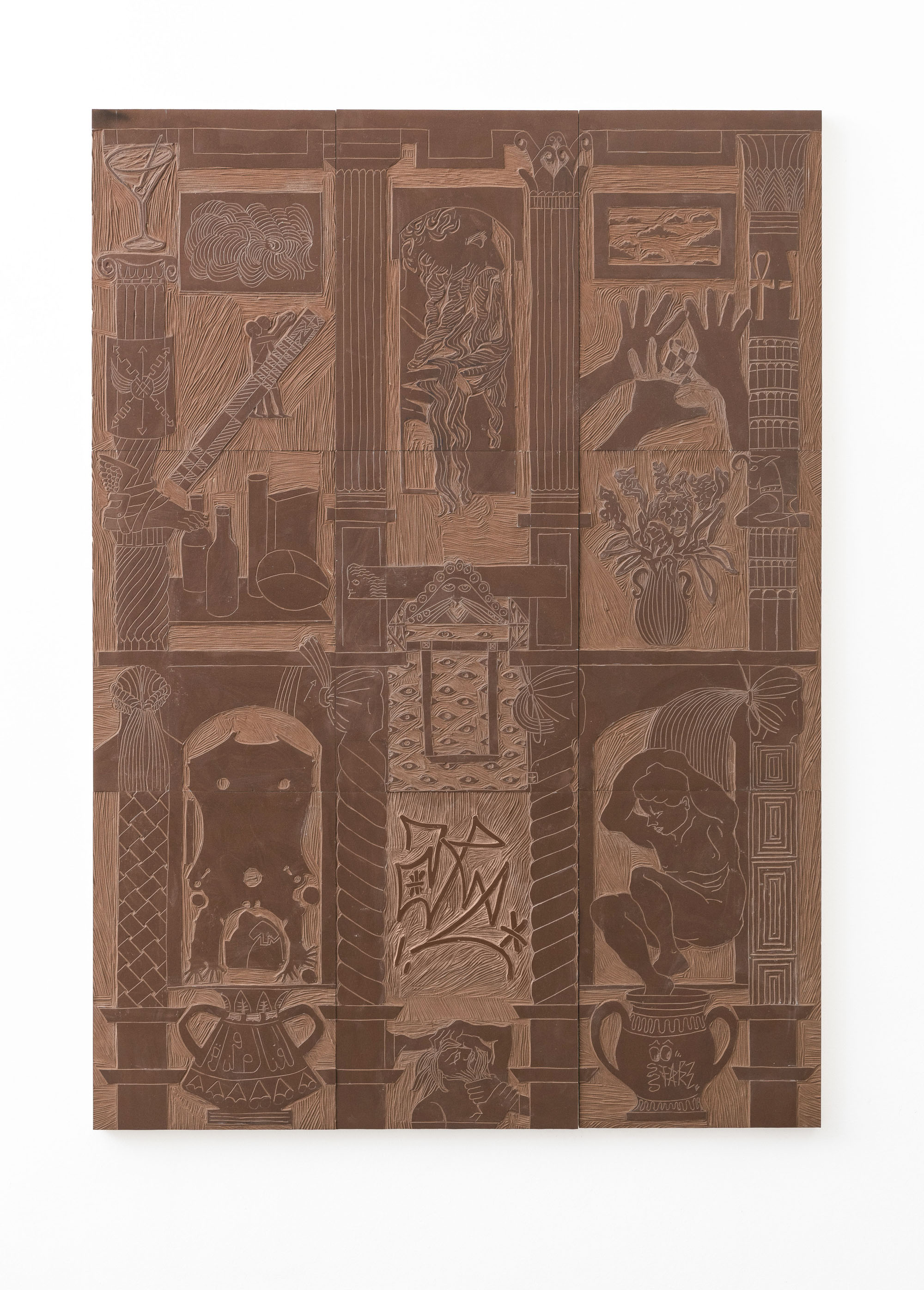 Le due grandi opere, situate al secondo piano della galleria, e realizzate durante il soggiorno della coppia all’American Academy di Roma nel 2019, raccontano il contesto della città e la sua stratificazione casuale: dagli antichi elementi architettonici visti durante le passeggiate, ai busti con la pettinatura “a coda di topo” degli anni Novanta, ispirata alla copia romana di Dioniso a Palazzo Massimo, agli occhi malvagi che si ritrovano su una tote bag della catena danese Flying Tiger. I due artisti creano una matrice di immagini in collisione, dove abbondano elementi formali e temporali, che vengono trasposti su due differenti superfici, il linoleum e il velluto, tramite l’incisione e la goffratura.