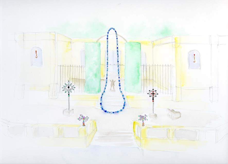 Quest’opera monumentale di 9 metri d’altezza sarà accompagnata da 4 sculture in alluminio a forma di croce, incastonata da perle di vetro colorate. Le due “Geometrie amorose”, in vetro verde e rosso saranno installate ai lati della collana, mentre le due sculture più piccole, i “Candelabri”, verranno collocate sulla balaustra della terrazza Marino Marini. Infine, due sculture di vetro sospese alle finestre del palazzo incorniceranno il grande collier.