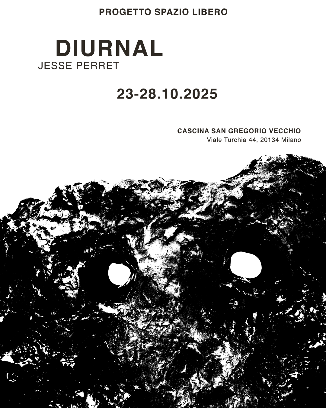 Progetto Spazio Libero presenta Diurnal, mostra personale di Jesse Perret, ospitata dal 23 al 28 ottobre 2025 presso Cascina San Gregorio Vecchio, che per l’occasione apre al pubblico dopo diversi anni di abbandono. L’esposizione segna la seconda tappa del percorso itinerante del progetto, dedicato al dialogo tra arte contemporanea e luoghi di memoria.