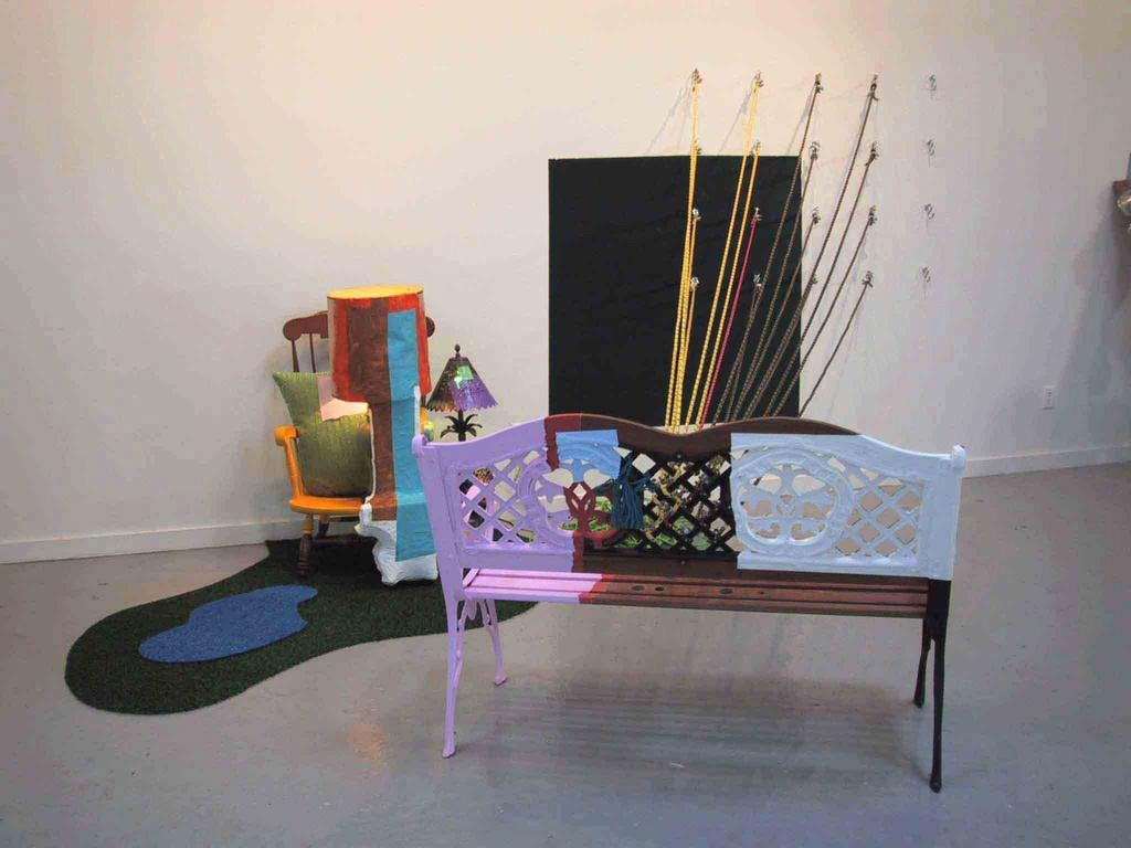 Jessica Stockholder, con i suoi celebri “accumuli,” creati dall’assemblaggio di oggetti di uso domestico: mobili, sedie, tappeti, - ma anche attrezzi da cucina come colapasta e contenitori di plastica - rivolge un impietoso sguardo sull’effimero che circonda la vita quotidiana. Dal momento in cui ciò che è familiare viene trasformato in inservibile catasta di materia, trasposto in puro oggetto da contemplare, immobile, mummificato, che non appartiene più a nessun mondo, diviene palese la precarietà e instabilità delle cose, e quindi dell’uomo. Inoltre, di fronte allo stravolgimento, dovuto ai colori acidi e intensi, spalmati senza apparente logica sugli “objets trouvés”, la percezione del visitatore è spiazzata dalla dicotomia evidente tra una prima visione “pittorica” (da uno sguardo lontano le opere appaiono come macchie di colore) e la plasticità tridimensionale che si evidenzia dopo un’analisi ravvicinata dei lavori. Ma l’artista non intende limitare allo sguardo, alla sola percezione visiva, l’approccio alle opere. Come afferma Giorgio Verzotti nel testo in catalogo: Lo spettatore di Stockolder non dovrà, evidentemente, basarsi solo sul senso della vista per orientarsi (letteralmente) nell’opera: i termini più spesso usati dall’artista afferiscono agli atti di muovere il corpo: “entering the gallery”, “walking through” e così via. Ruolo importante è inoltre svolto dalla memoria: Un altro suo termine chiave è “memory”: esercitare la memoria di ciò che si è appena visto nel momento in cui, muovendosi, si passa a guardare altro, così da connettere insieme, mentalmente, tutti gli stimoli che l’installazione induce.