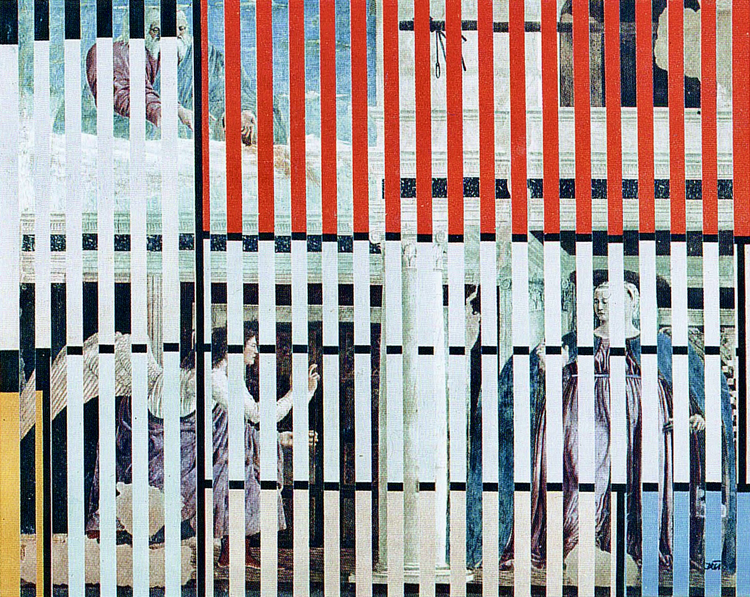 Una Composizione di Piet Mondrian è intercalata all’Annunciazione della Leggenda della Vera Croce di Piero della Francesca; la sagoma dell’Uccello nello spazio di Costantin Brancusi lascia intravedere il seno adolescente de La sorgente di Ingres o ancora le Attese di Lucio Fontana che sovrastano la cacciata di Masaccio nell’opera L’arte moderna scaccia l’arte antica. Sarà un viaggio affascinante, in cui il visitatore potrà cimentarsi a scoprire le opere frammentate nei collage!