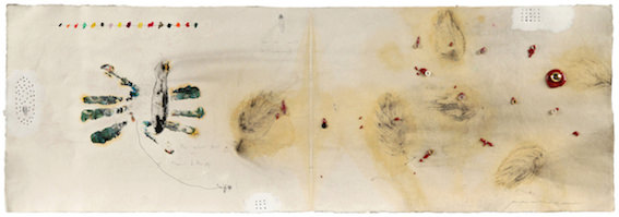 Altro elemento peculiare dell’intera opera di Massana è l’utilizzo e l’inclusione di materiali disparati che si amalgamano alla grafia e alla pittura, questa complicità materica, oltre ad aggettare le opere in una vera e propria tridimensionalità, contribuisce ad accentuare la componente narrativa delle opere stesse.