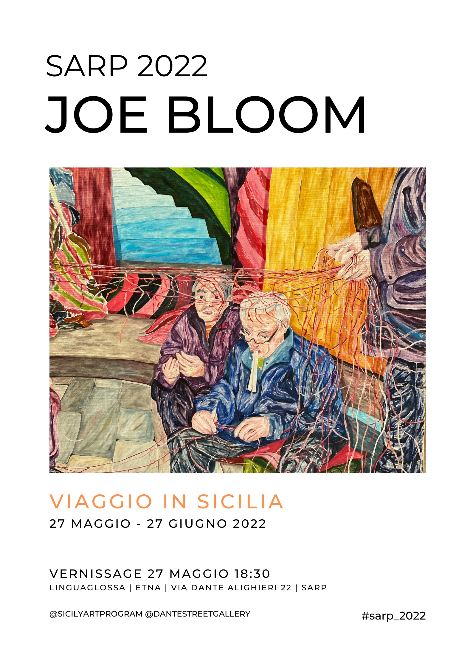 I lavori di questa mostra di Joe Bloom, sono lavori realizzati dall’artista durante il suo soggiorno in Sicilia, presso SARP (Sicily Artist in Residence Program) e Palazzo Previtera. Dipinti e disegni compongono la mostra di Joe Bloom, artista e cineasta londinese, che sperimenta in modo attento e dinamico i vari linguaggi e i diversi modi di osservare l’esistenza.