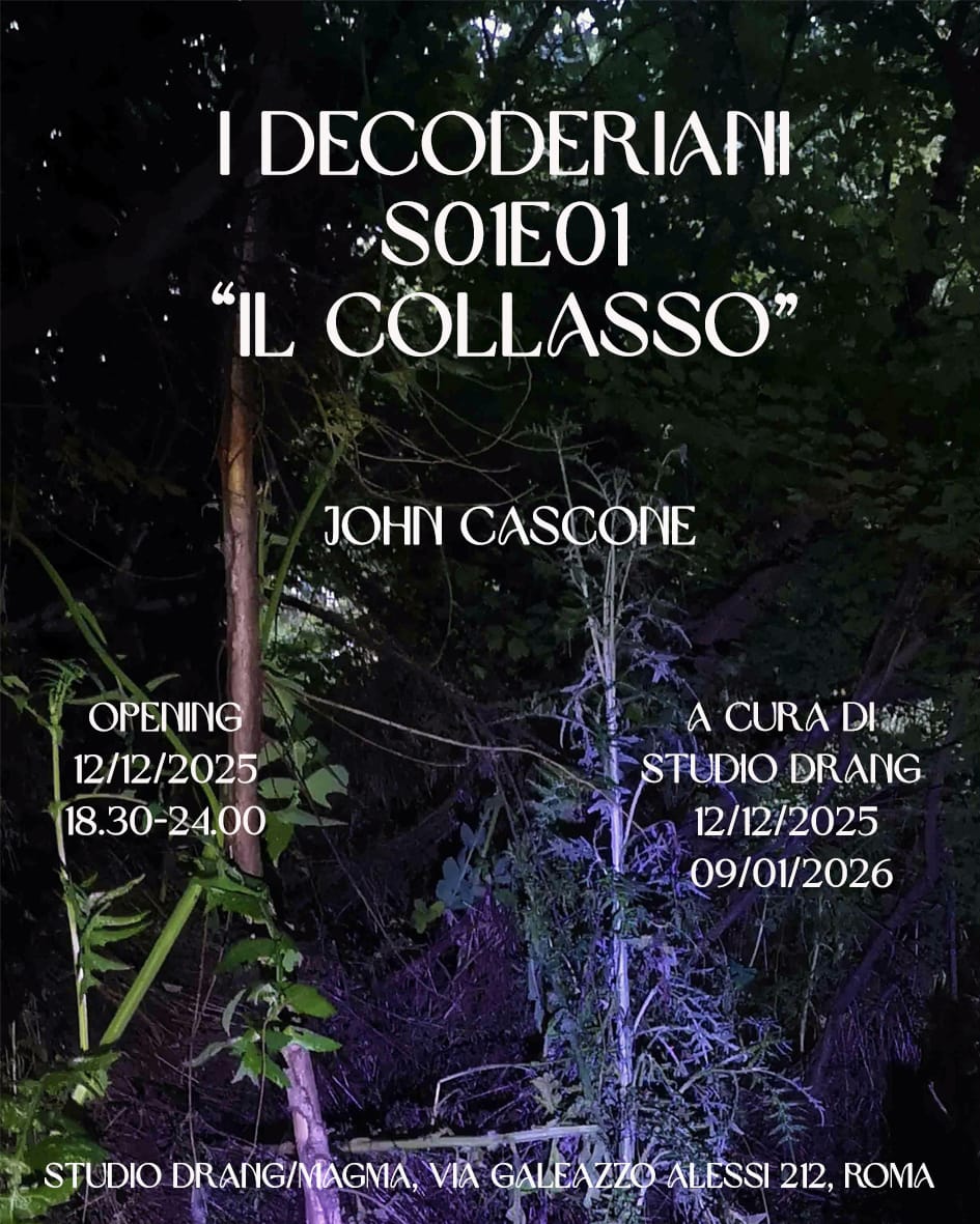 John Cascone I DECODERIANI S01E1 “IL COLLASSO” a cura di Studio Drang Opening 12/12/2025 dalle 18.30 alle 24.00 in mostra fino al 9/01/26 (su appuntamento) via Galeazzo Alessi 212, Roma