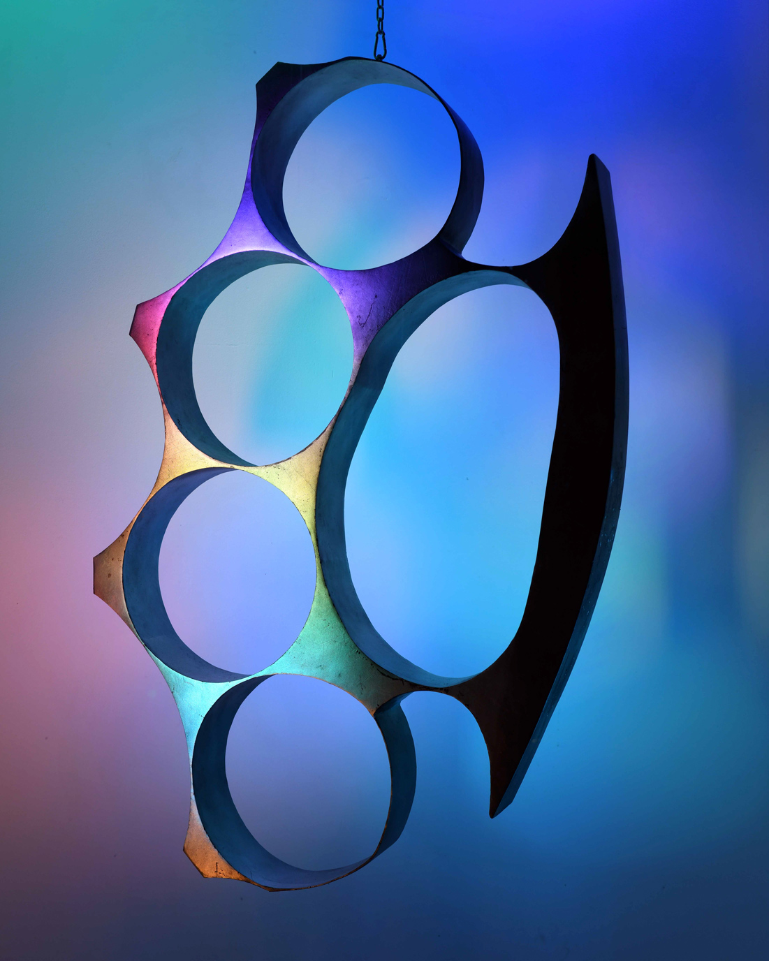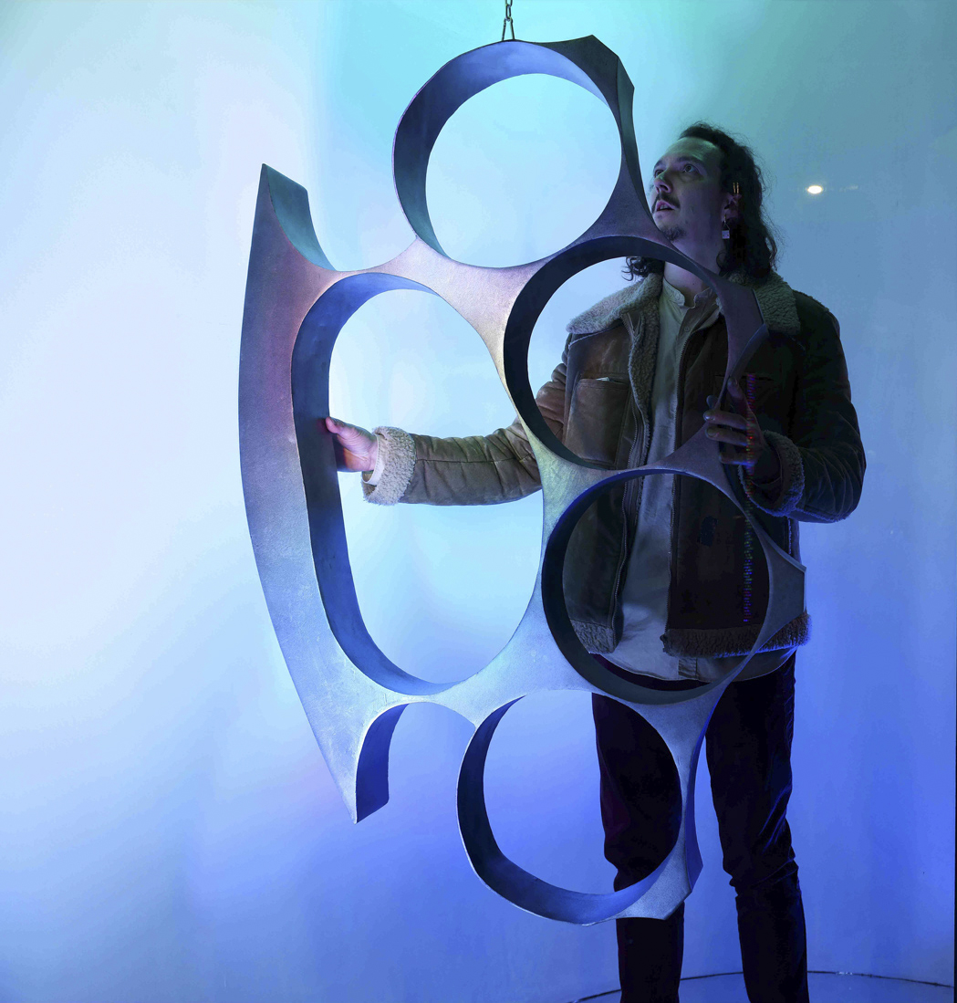 Nell’opera scultorea crying how bright, esposta nella sala principale, un’immagine violenta come un’arma si trasforma in pesante apparato da festa. Trattasi di un tirapugni di dimensioni esasperate in grandezza che, accompagnato dal movimento di luci in costante cambiamento cromatico si mantiene seducente ed ipnotico gravitando appeso attorno al suo baricentro. Malinconico si fa l’intorno quando il protagonista è lasciato solo a volteggiare lento.
