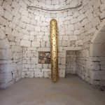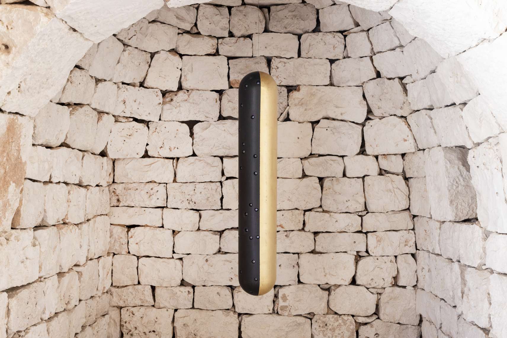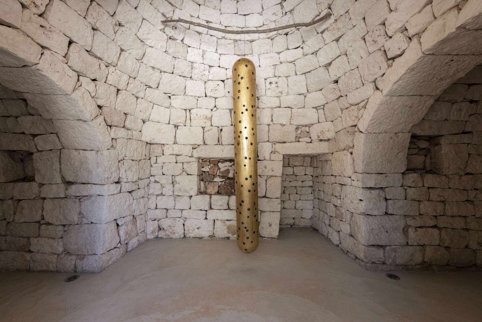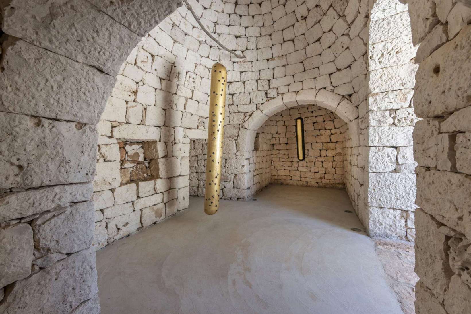 Nella suggestiva cornice di un trullo pugliese, la mostra di John Torreano rappresenta un dialogo innovativo tra arte contemporanea e tradizione locale. L’architettura unica e affascinante dei trulli ha ispirato l’artista americano, che per questa esposizione ha scelto di presentare alcune delle sue iconiche Column Paintings: colonne dorate e nere adornate da gemme acriliche. Queste sculture non solo si integrano perfettamente con l'ambiente circostante, ma evocano anche il sacro e il rituale, simboleggiando altari e luci votive.
