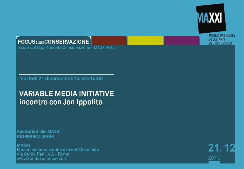 Al MAXXI Jon Ippolito presenterà il Variable Media Network, una piattaforma di lavoro per la conservazione dell’arte contemporanea che affronta le questioni legate all’invecchiamento dei dispositivi tecnologici utilizzati in alcune opere. Il VMN include istituzioni ed esperti da tutto il mondo, tra cui l’University of Maine, il Berkeley Art Museum/Pacific Film Archives, Franklin Furnace, Rhizome.org, il Performance Art Festival & Archives, il Whitney Museum of American Art di New York.