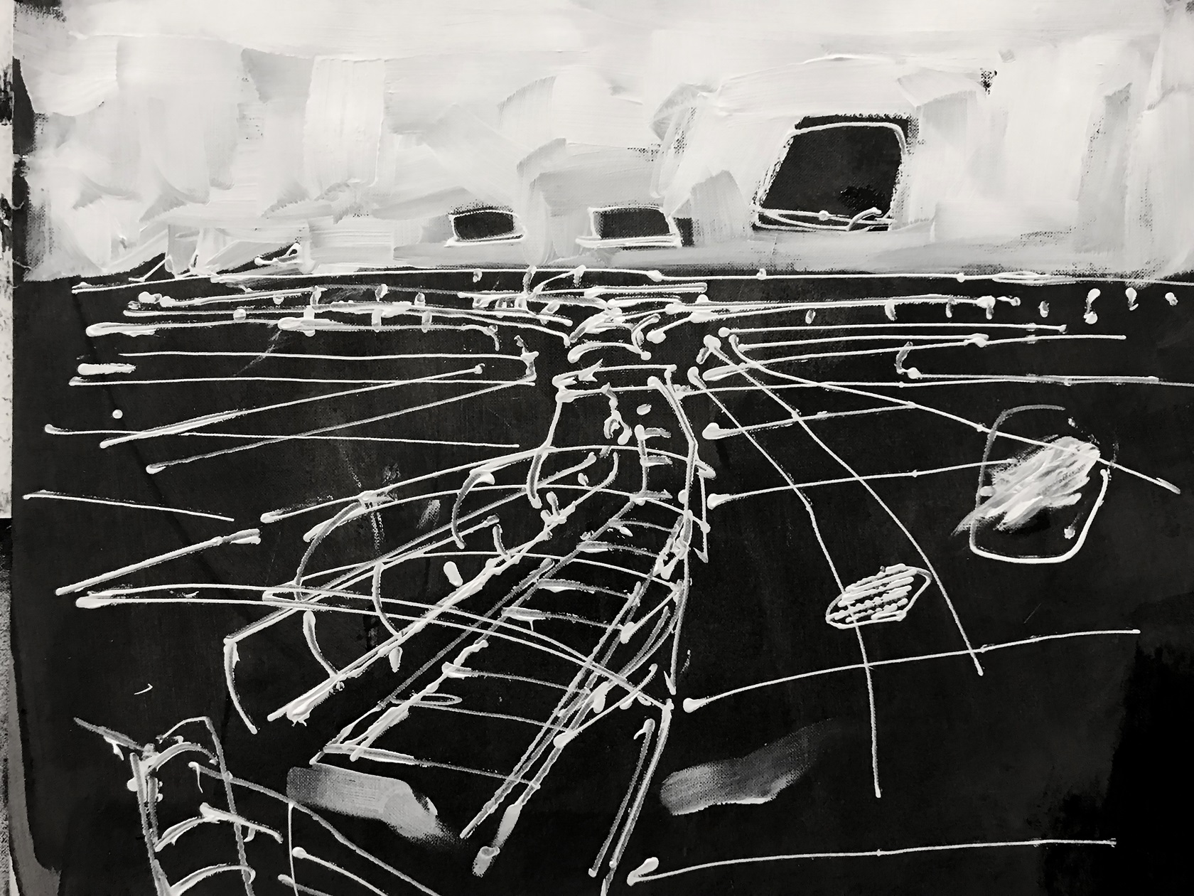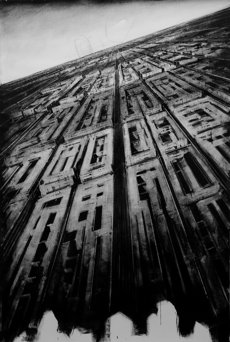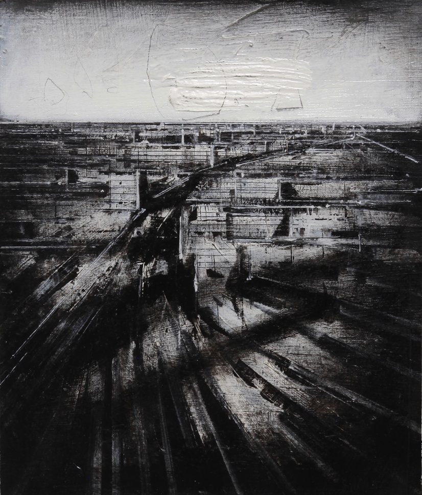 I quadri dell’artista internazionalmente riconosciuto, sono metafore della realtà fissate sulla tela da un costante bicromatismo, visioni costruite attraverso un linguaggio che si muove tra pittura e architettura sono vedute metropolitane, prospettive a volo d’uccello, paesaggi urbani e panoramiche.
