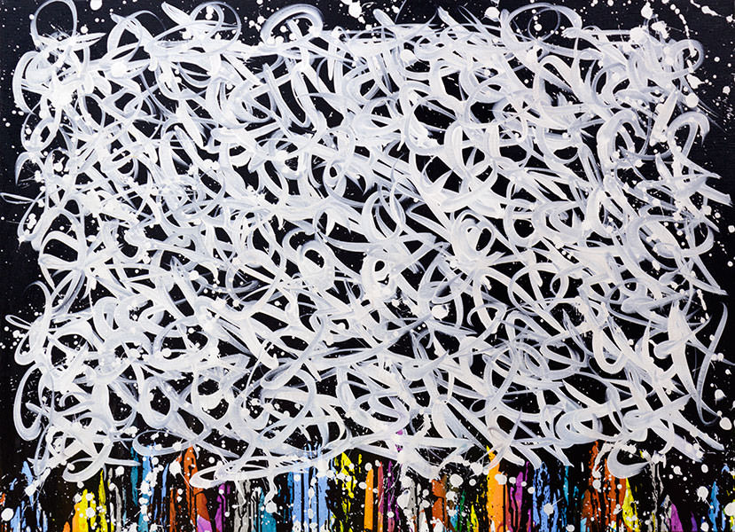 JonOne, francese d’adozione, è uno dei più importanti artisti contemporanei e figura chiave del mondo dei graffiti. I suoi lavori sono stati esposti in celebri istituzioni come la Fondation Cartier e il Grand Palais di Parigi. Vanta collaborazioni con brand internazionali del calibro di Lacoste, Perrier, Air France e Guerlain. Di difficile collocazione all’interno di un unico movimento artistico, la sua produzione è il risultato dell’unione perfetta tra graffiti e espressionismo astratto, tra calligrafia e uso performativo del colore.